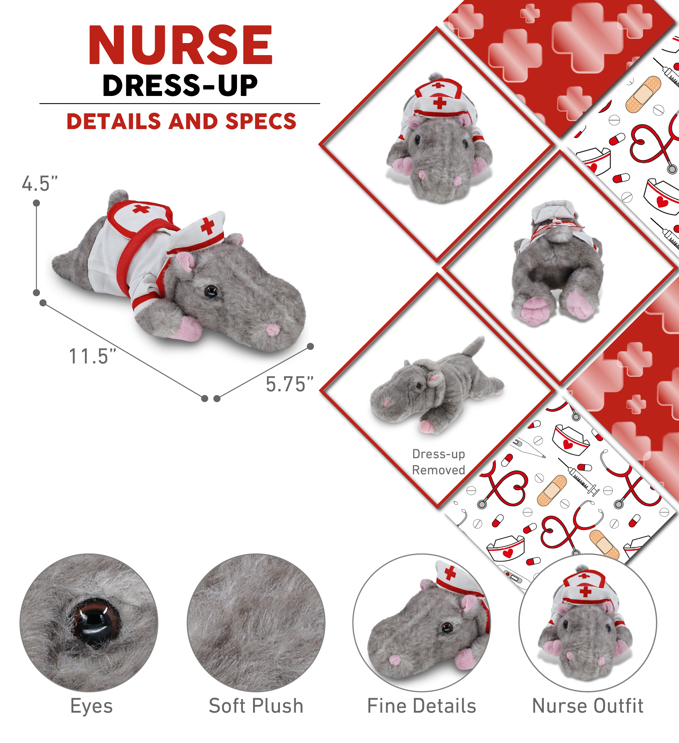 - Hippo with Nurse Stuffed Animal Clothes Features a Classic Nurse Outfit – Designed with red lining and a cross against the white nurse dress and the nurse cap and apron. The hippopotamus stuffed animal plush has soft grey plush, perfect for everyday snuggles. This stuffed animal with clothes makes the perfect addition to your collection of character teddy bear with clothes or giveaway hospital toys to give to sick children.