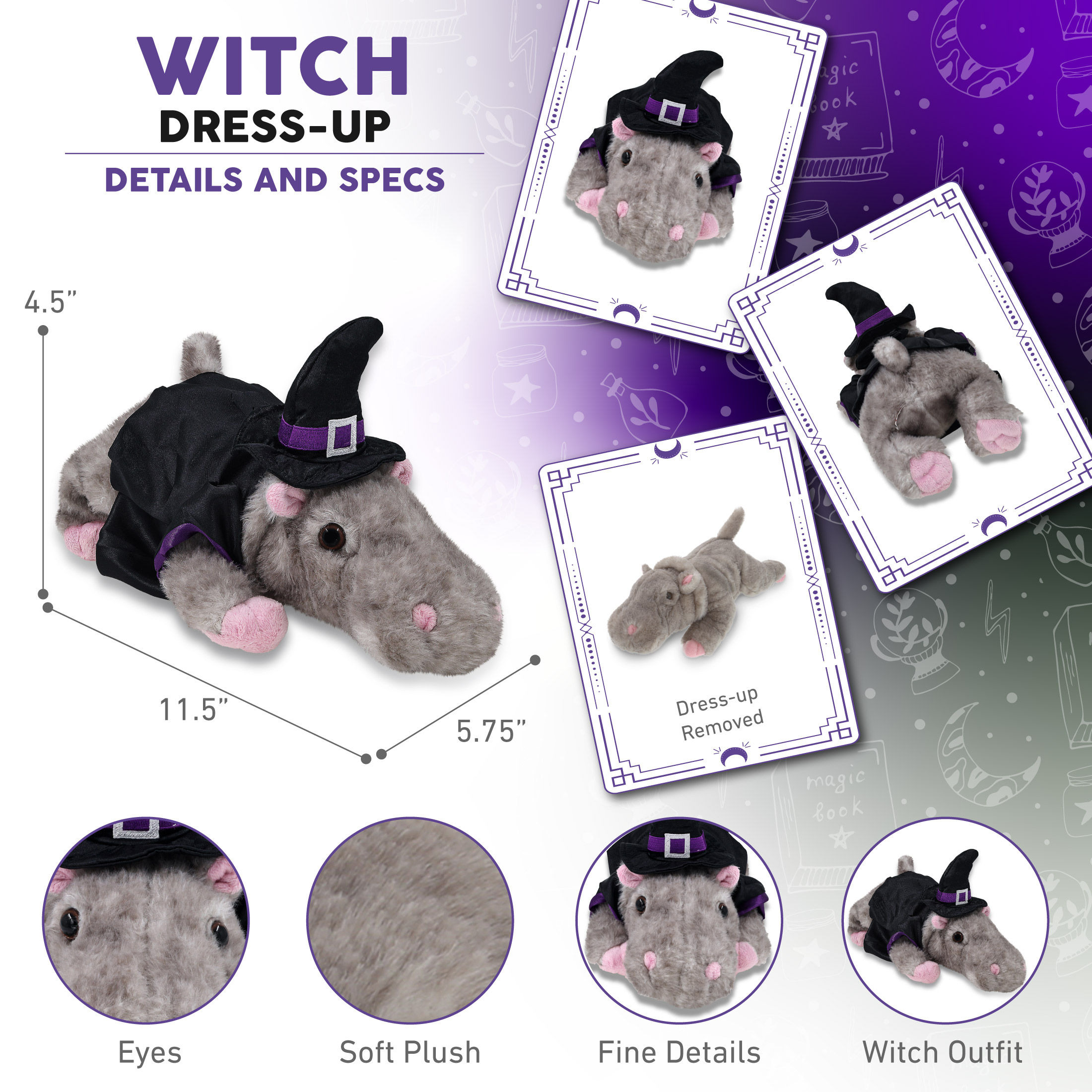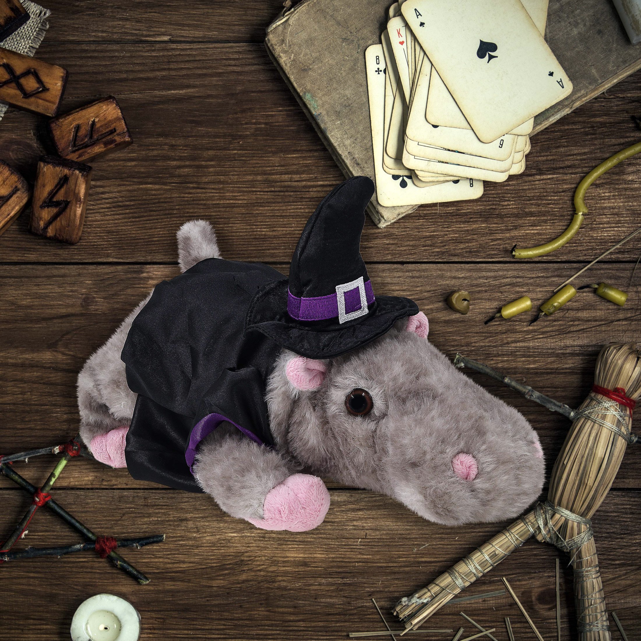 - Includes 1 DolliBu Wild Hippo Toy Dressed in Witch Costume – The plush teddy bear arrives with a witch stuffed animal costume. The witch stuffed hippo toy features a black witch dress up set with intricate purple details and black bow with gem. The perfect teddy bear plush to add spooky vibes to a display, along with your other Halloween stuffed animals. A cute stuffed animal for anyone ages 3 and up who is looking for a cute hippo figure.
