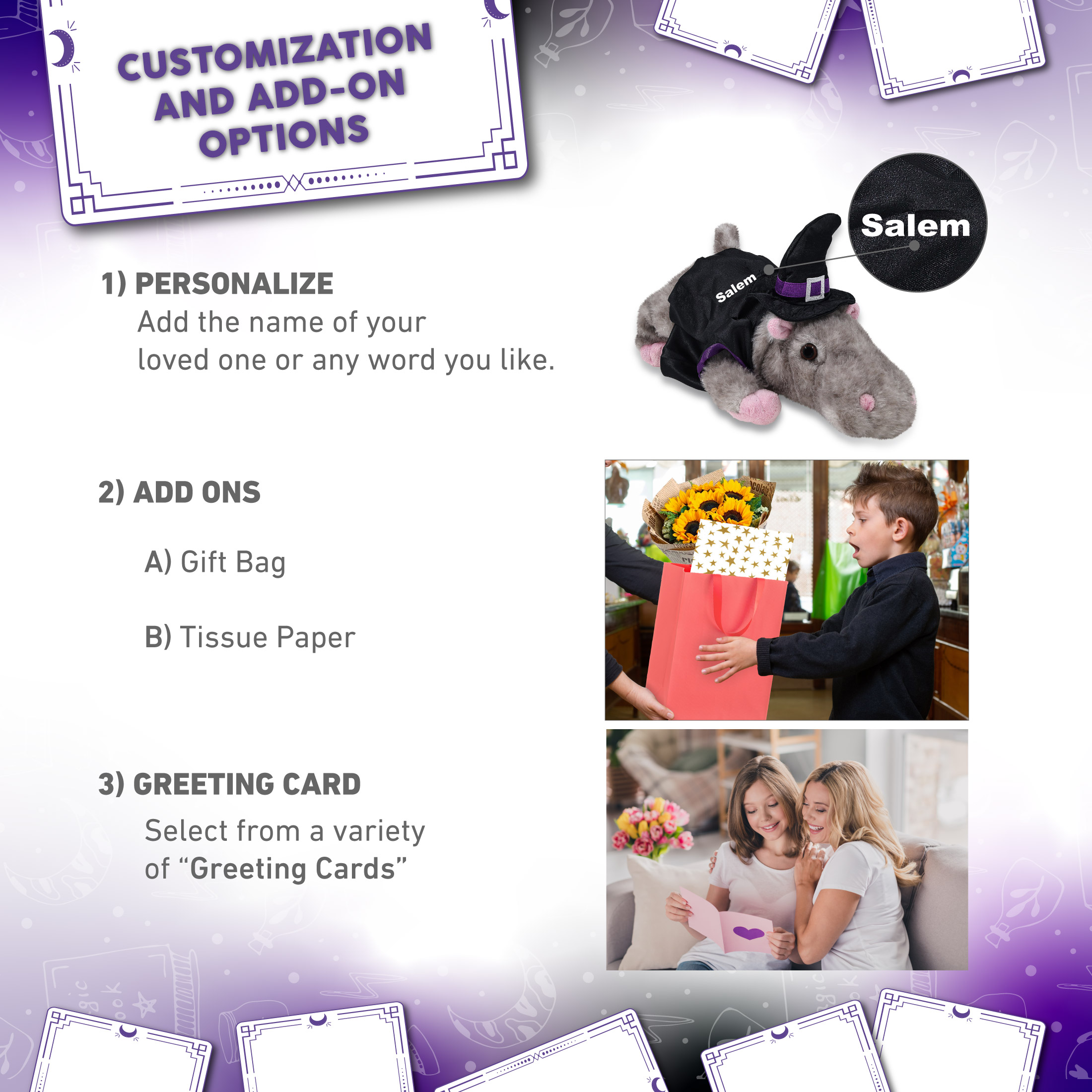 - Personalization, Customization, and Add-On Options – The hippo Halloween plush toy comes dressed in a witch outfit, complete with black and purple cloak and pointy black witch hat. Make your teddy bear doll special by adding a personalized name, which we will imprint onto the plush. You can also customize your witch hippo stuffed animal by adding any of our add-ons to create the perfect gift: 1) Gift Bag 2) Tissue Paper 3) Greeting Card.