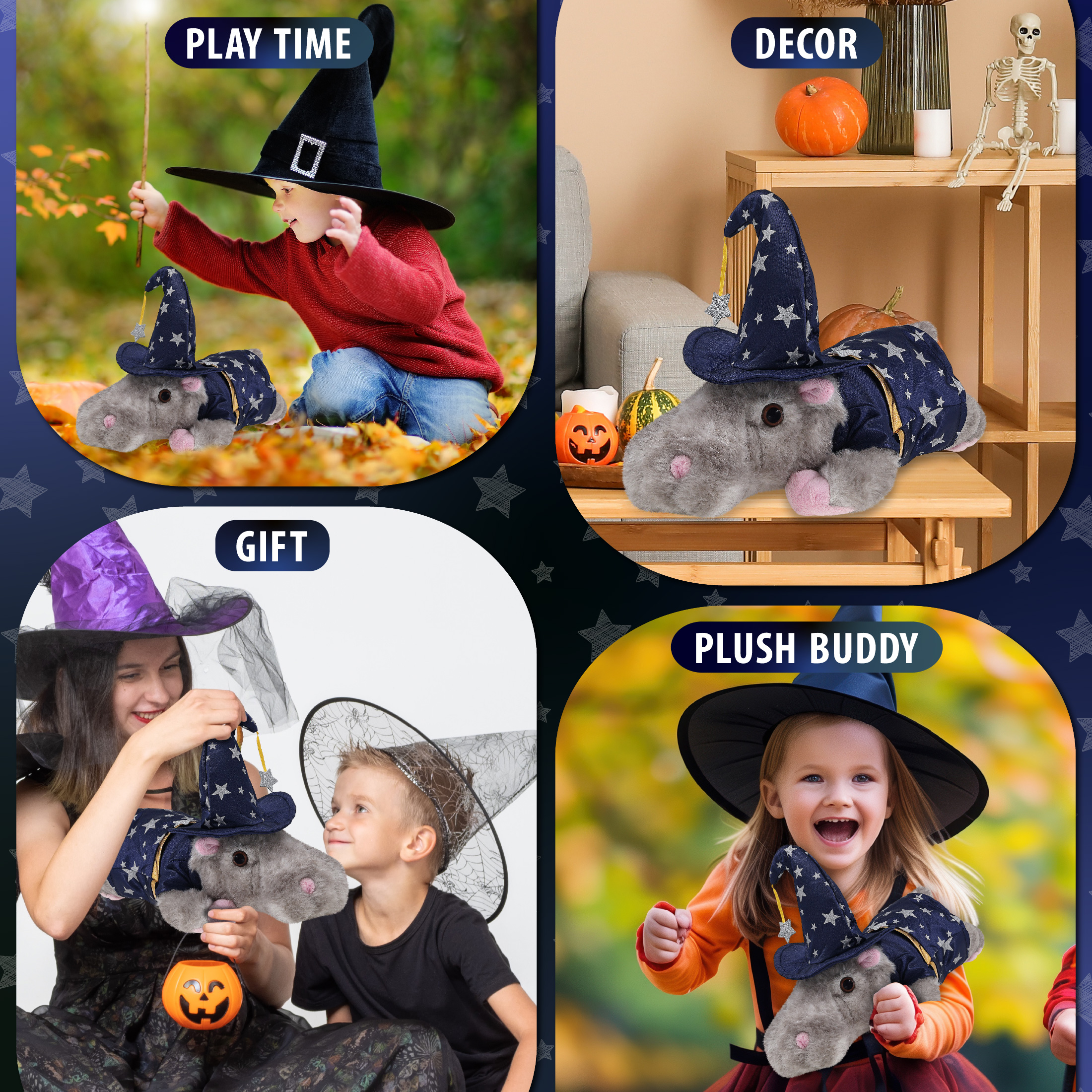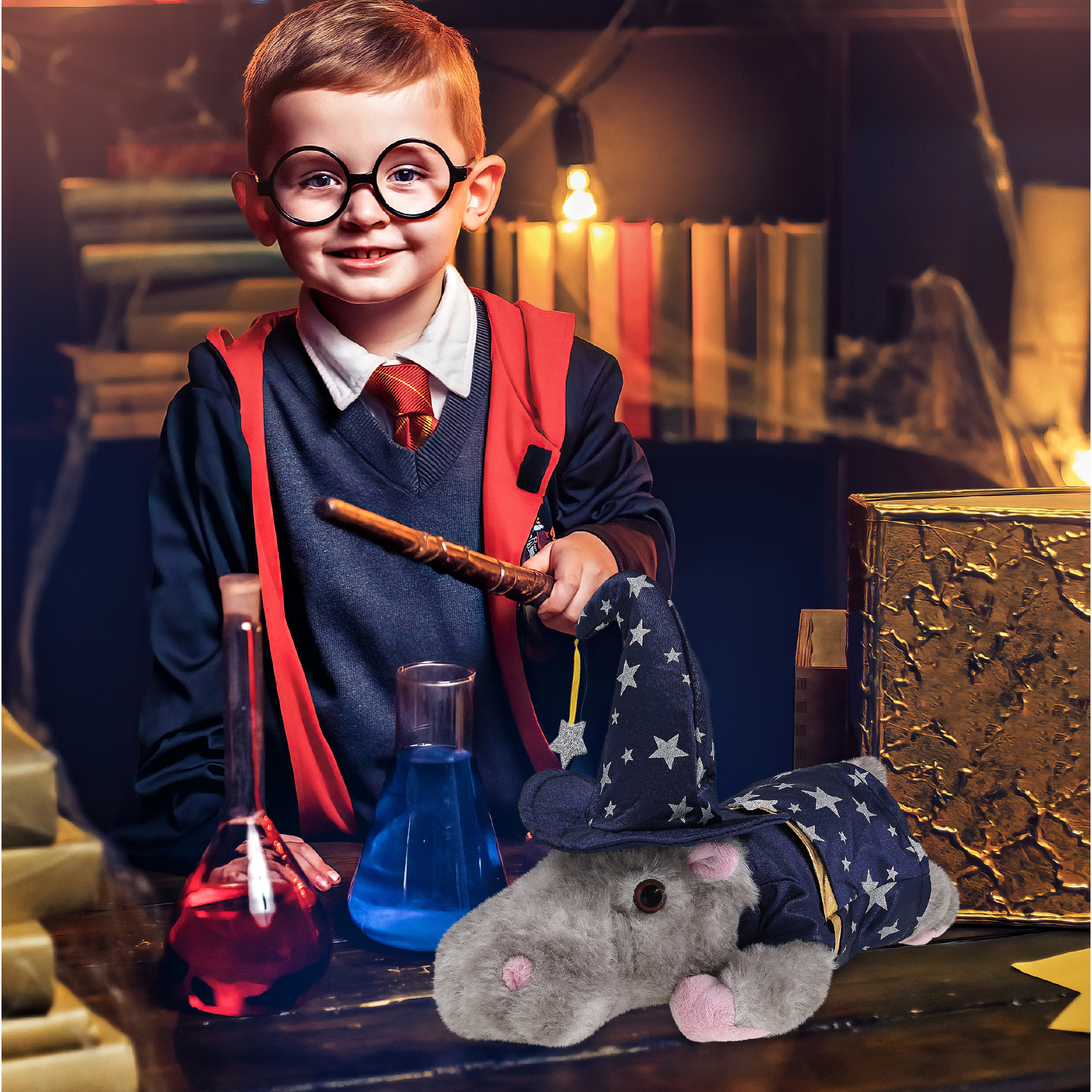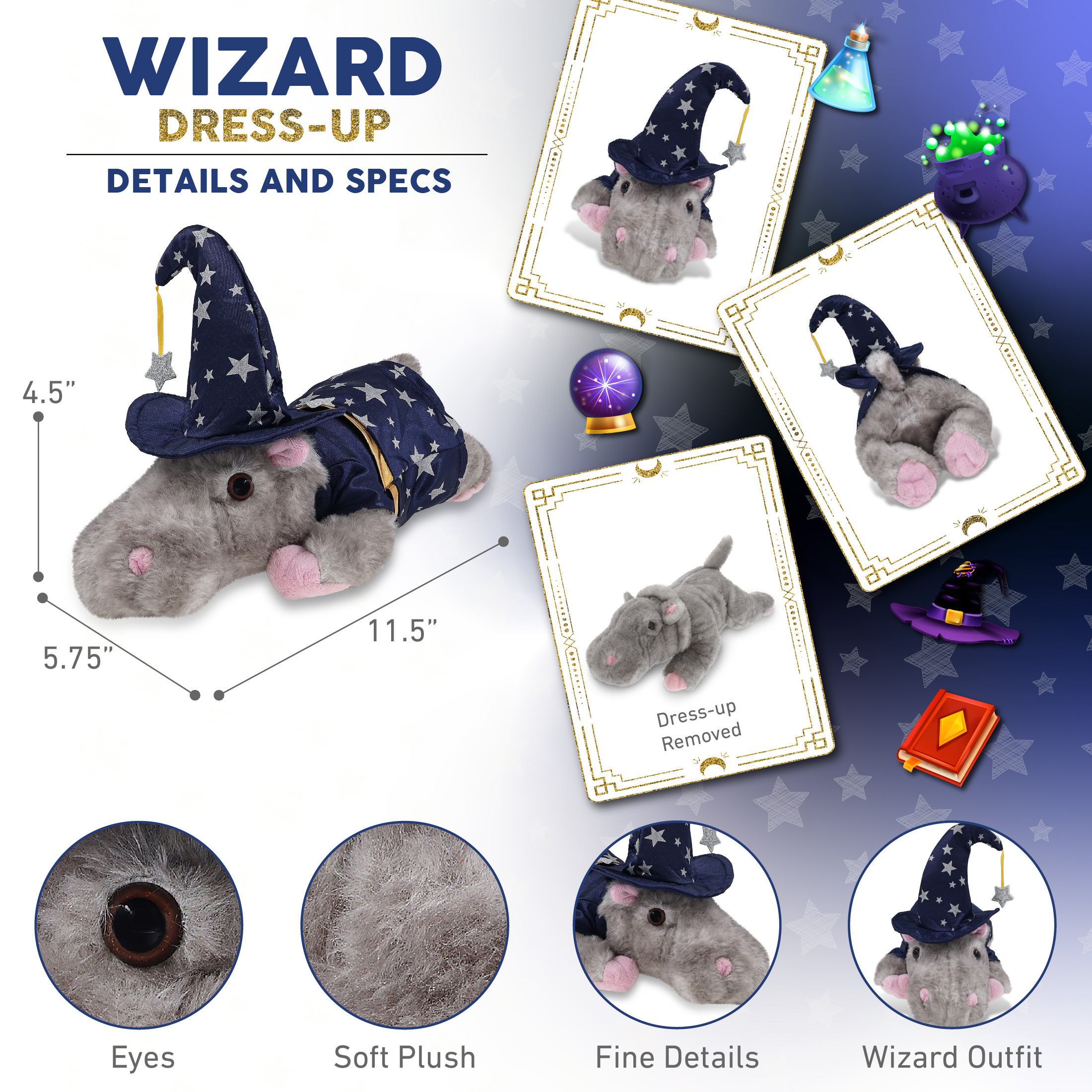 - Features a Cute Teddy Bear Plush with Wizard Teddy Bear Costume – With a wizard cloak and wizard stuffed animal hat adorned with silver stars, this hippopotamus Halloween stuffed animal has a playful and stylish magical look! The detailed wizard costume adds character to your floppy stuffed animal toys and makes them stand out among other cute plush toys. Everyone will love to play with a huggable stuffed animal with a wizard dress up set.