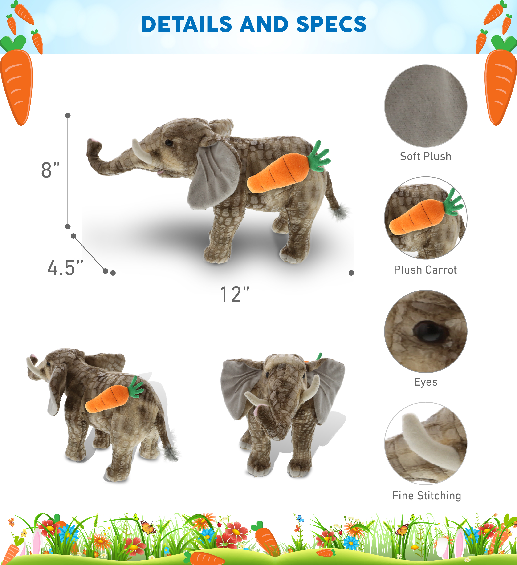 - HIGH-QUALITY TEDDY BEAR WITH CARROT – The Super Soft Plush Elephant is a plush toy made of premium-quality polyester and stuffed with soft fillings. Covered with gray fluffy plush. A snuggly safari life toy crafted with durable materials, designed to deliver a Welcome Spring and Happy Easter message to your loved ones in an adorable way. To maintain the cleanliness of the Elephant plush, surface wash with cold water and allow to air dry.