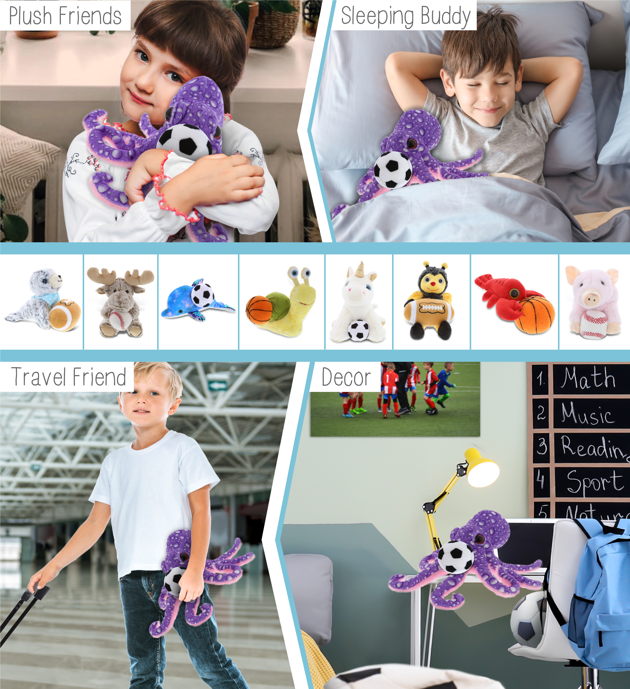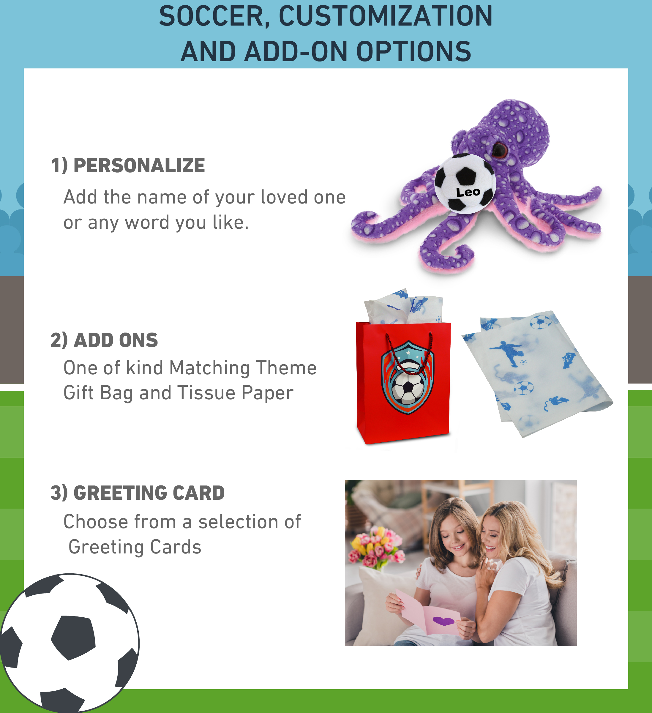 - PERSONALIZATION, CUSTOMIZATION, AND ADD-ON OPTIONS – Super Soft Sports Stuffed Animal Purple Octopus comes customized with a Soccer Ball Plush. You can personalize it with the name of your loved one imprinted on the item. You also have the option to add some or all of the cool add-ons to make your gift extra special: 1) Gift Bag; 2) Tissue Paper; 3) Greeting Card.