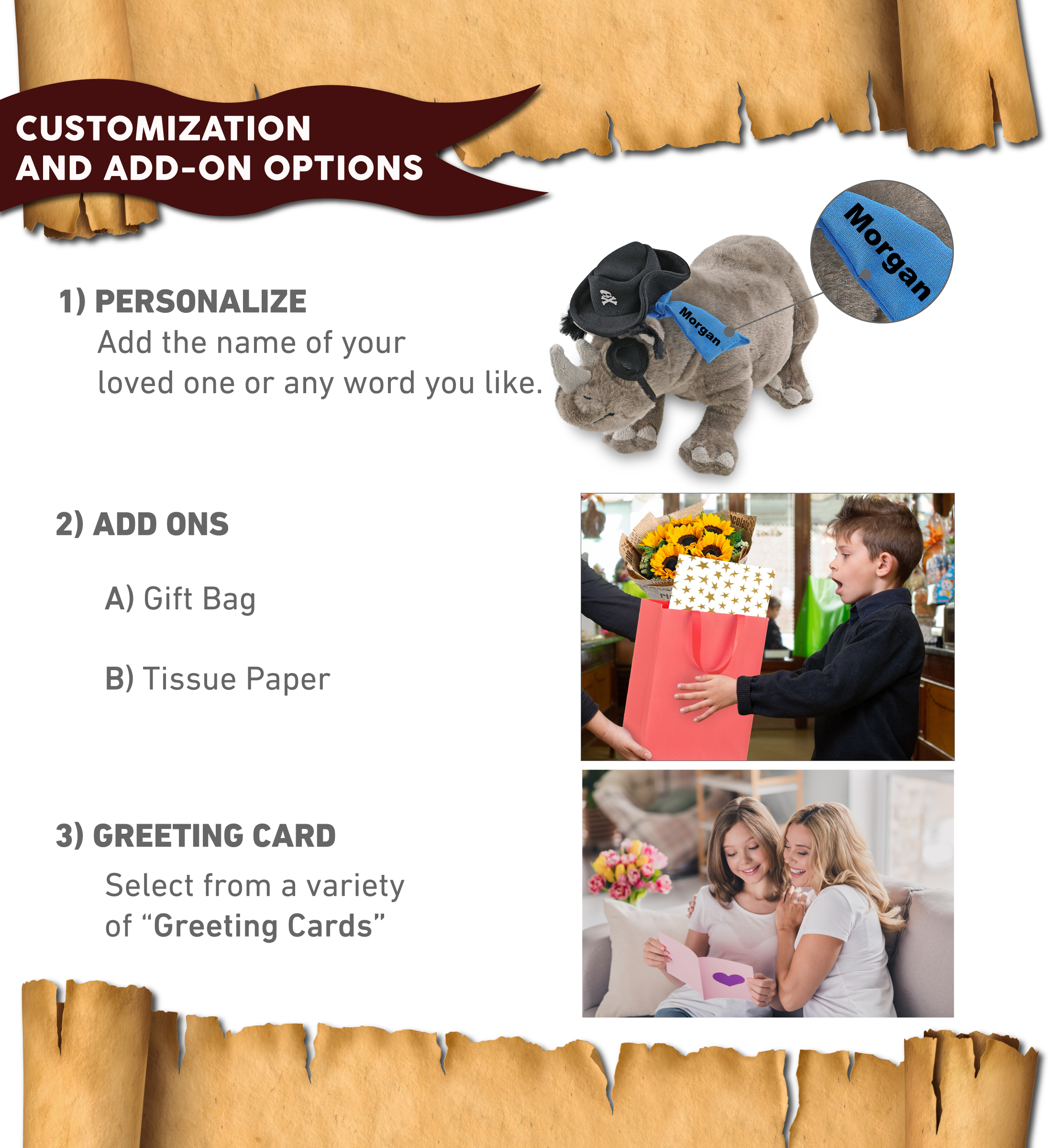 - Personalization, Customization, and Add-On Options – The stuffed animal plush rhino figure stuffed toy comes with a cute pirate hat. Make your plush rhinoceros special by adding a personalized name, which we will imprint onto the plush. You can also customize your stuffed animal pirate rhino doll by adding any of our add-ons to create the perfect gift: 1) Gift Bag 2) Tissue Paper 3) Greeting Card.