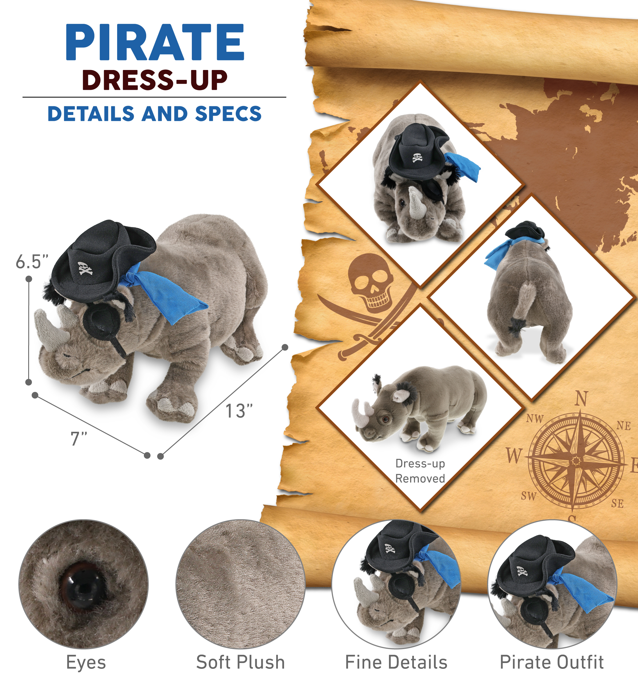 - Includes 1 DolliBu Wild Collection Rhino Toy with Pirate Outfit – The stuffed animal rhino doll wears a pirate costume featuring a pirate hat. Whether you’re collecting rhino toys or hunting for pirate stuff for kids, this toy rhino is the perfect combo of silly plush fun and dress-up adventure. This cute stuffed animal pirate plush rhino measures approximately 13Lx7Wx6.5H inches. This cute rhino plush is best for kids ages 3 and up.