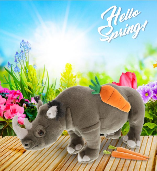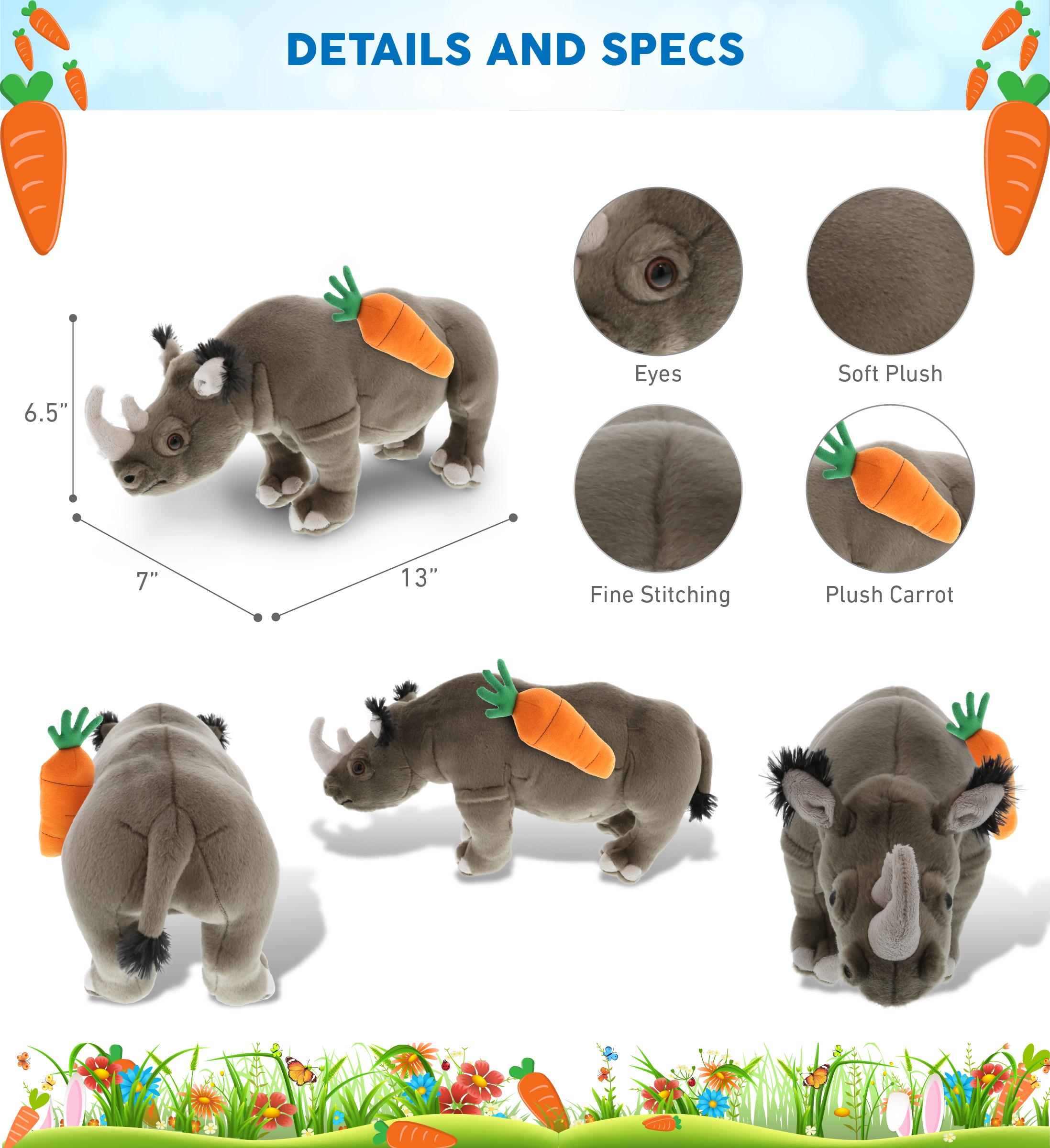 - HIGH-QUALITY TEDDY BEAR WITH CARROT – The Super Soft Plush Rhino is a plush toy made of premium-quality polyester and stuffed with soft fillings. Covered with gray fluffy plush. A snuggly safari life toy crafted with durable materials, designed to deliver a Welcome Spring and Happy Easter message to your loved ones in an adorable way. To maintain the cleanliness of the Rhinoceros plush, surface wash with cold water and allow to air dry.