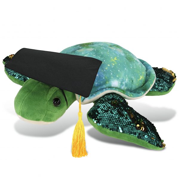 - INCLUDED WITH THE PURCHASE – Includes 1 Sea Turtle – Space Sequin Plush Toy with a graduation cap. The adorable sea turtle plush animal is wearing a removable black graduation cap with a yellow tassel. Decorated with realistic designs and fluffy plush that makes the graduation custom sea turtle – space sequin perfect for cuddles and snuggles. This cute sea turtle graduation stuffed toy measures about 13Lx16.5Wx4H inches.