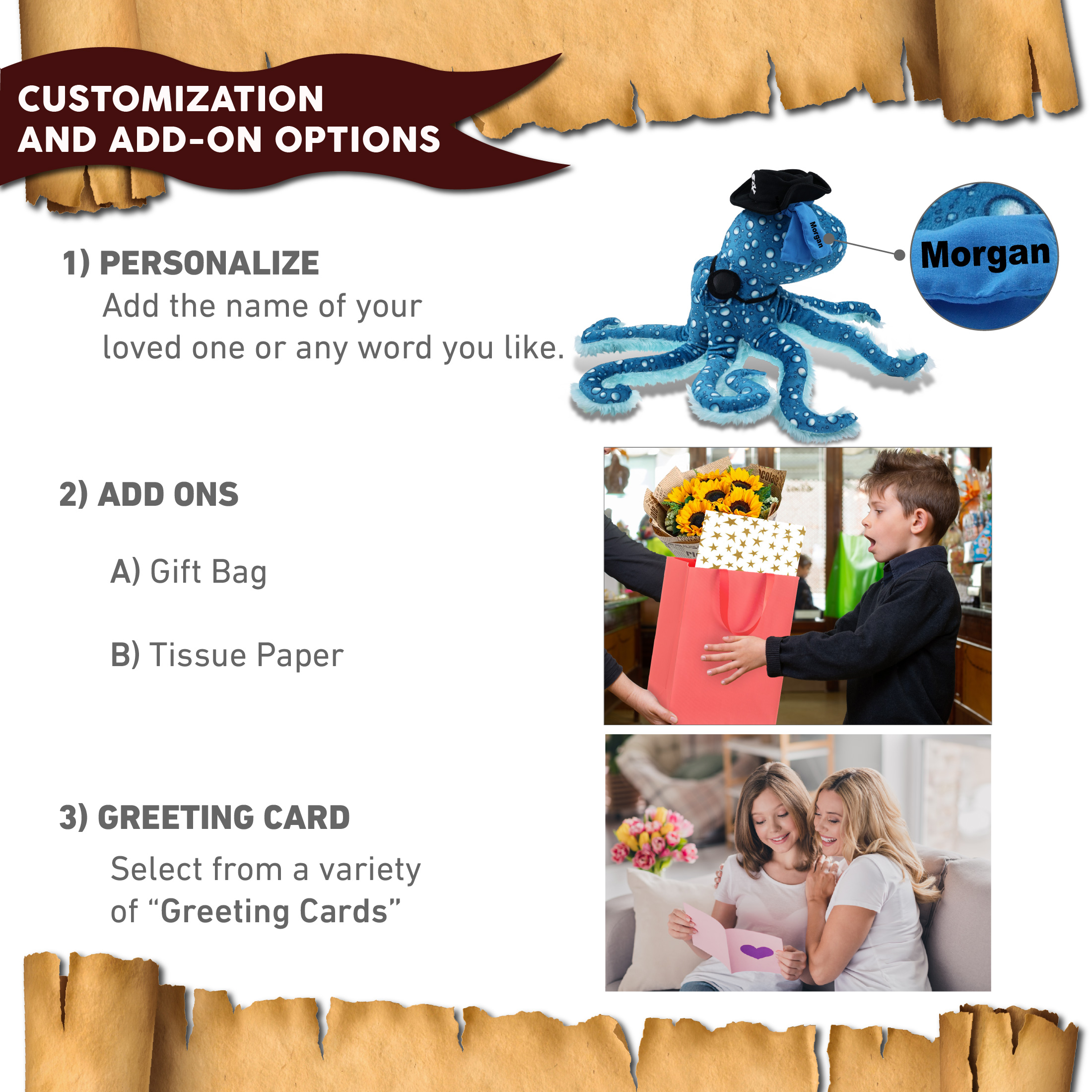 - Personalization, Customization, and Add-On Options – The stuffed animal plush octopus figure stuffed toy comes with a cute pirate hat. Make your plush blue octopus special by adding a personalized name, which we will imprint onto the plush. You can also customize your stuffed animal pirate octopus doll by adding any of our add-ons to create the perfect gift: 1) Gift Bag 2) Tissue Paper 3) Greeting Card.