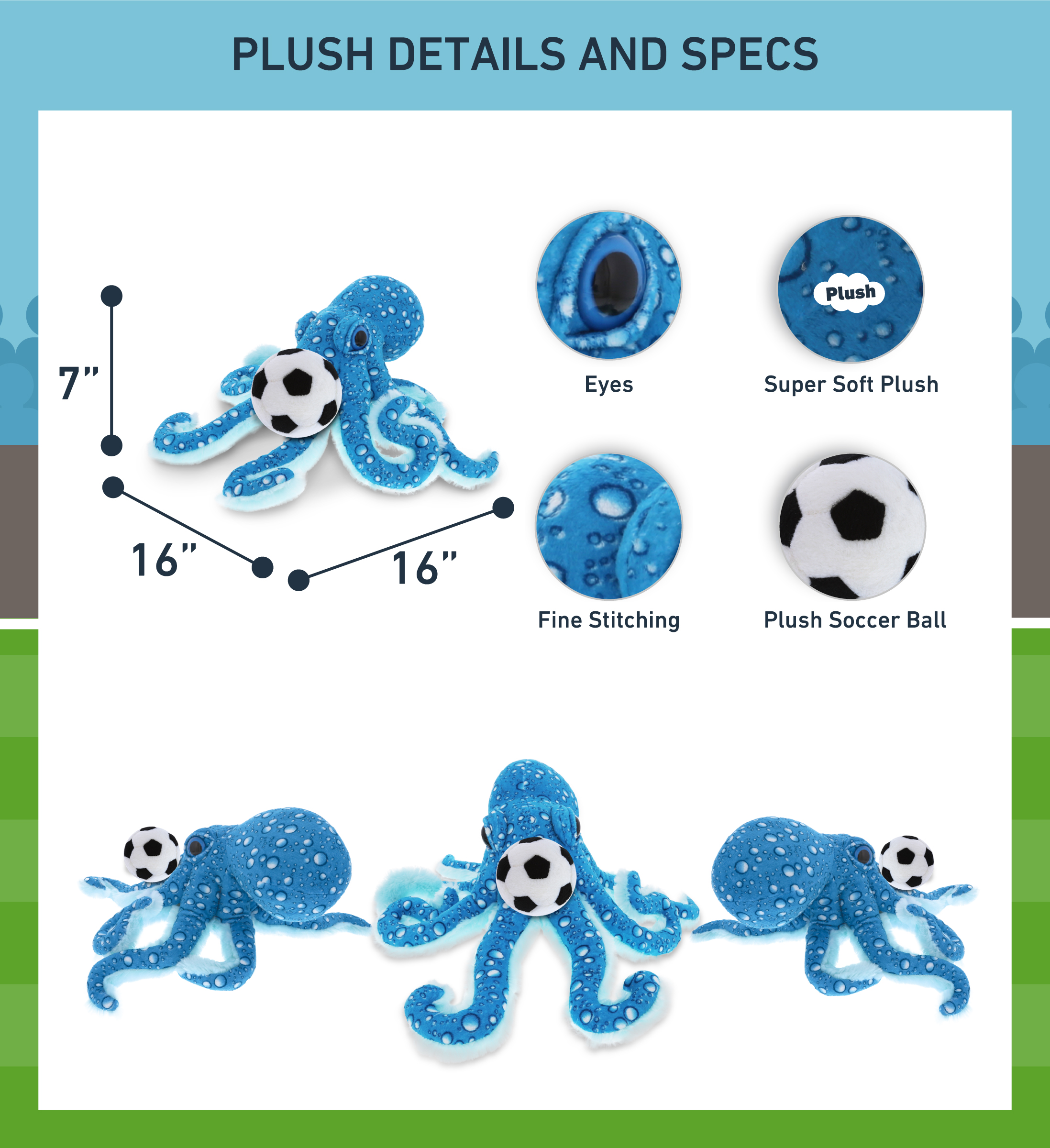 - INCLUDED WITH THE PURCHASE OF ADORABLE CUTE BLUE OCTOPUS PLUSH – Includes 1 DolliBu Blue Octopus Wild Collection Plush with a soccer ball plush, decorated with realistic features of cute octopus. The octopus’ body with a sports gift ball plush makes the plush perfect for cuddles. The octopus plush toy features details like its characteristic tentacles. The octopus’ eyes make the critter so charming. The plush toy buddy measures 16Lx16Wx7H inches.