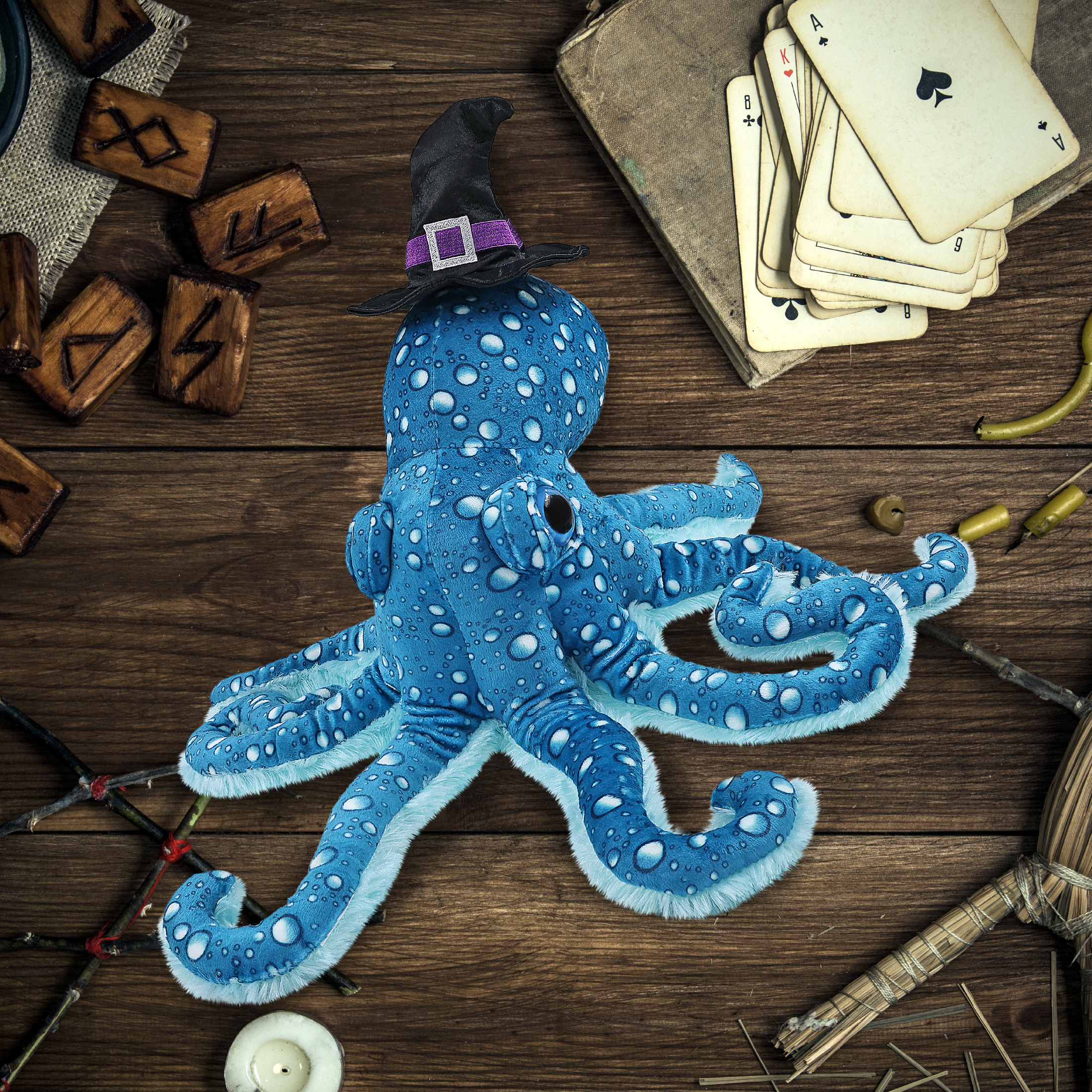 - Includes 1 DolliBu Wild Collection Blue Octopus Toy Dressed in Witch Costume – The plush blue octopus arrives with a witch stuffed animal costume outfit hat. The witch stuffed octopus toy features a black witch dress up hat with intricate purple details. The perfect octopus plush to add spooky vibes to a display, along with other Halloween stuffed animals. A cute stuffed animal that measures 16Lx16Wx7H inches, for anyone ages 3 and up.