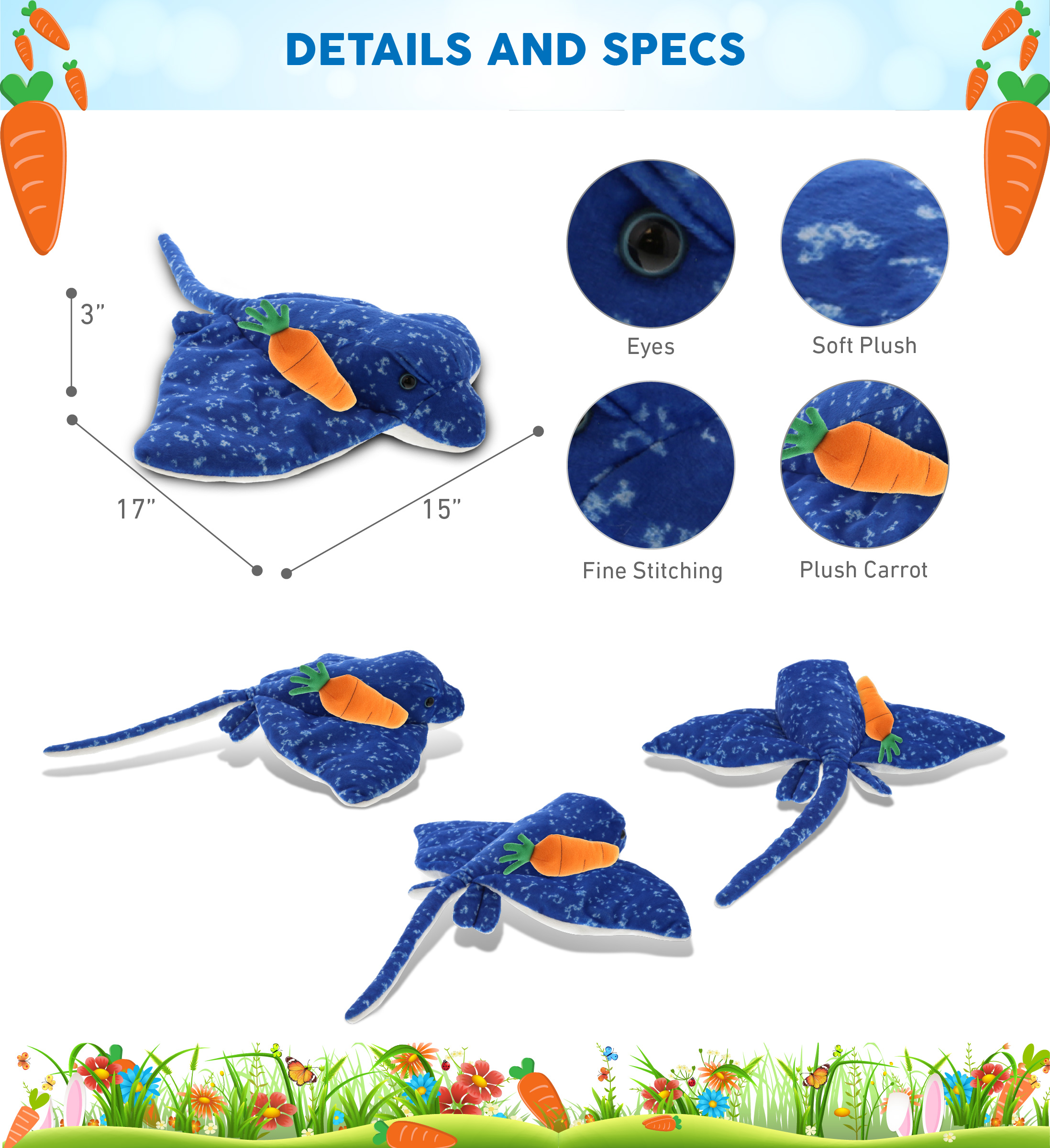- INCLUDED WITH THE PURCHASE – Includes 1 DolliBu Super Soft Plush Spotted Blue Ray stuffed toy perfect to celebrate the beginning of a new season. The Blue Ray ocean life plush comes with an orange carrot stuffed toy attached to the chest of the stuffed animal. Decorated with a unique blue plush, realistic design, and soft fabric that makes it perfect for cuddles and snuggles. This cute Blue Ray plush toy measures 17Lx15Wx3H inches.
