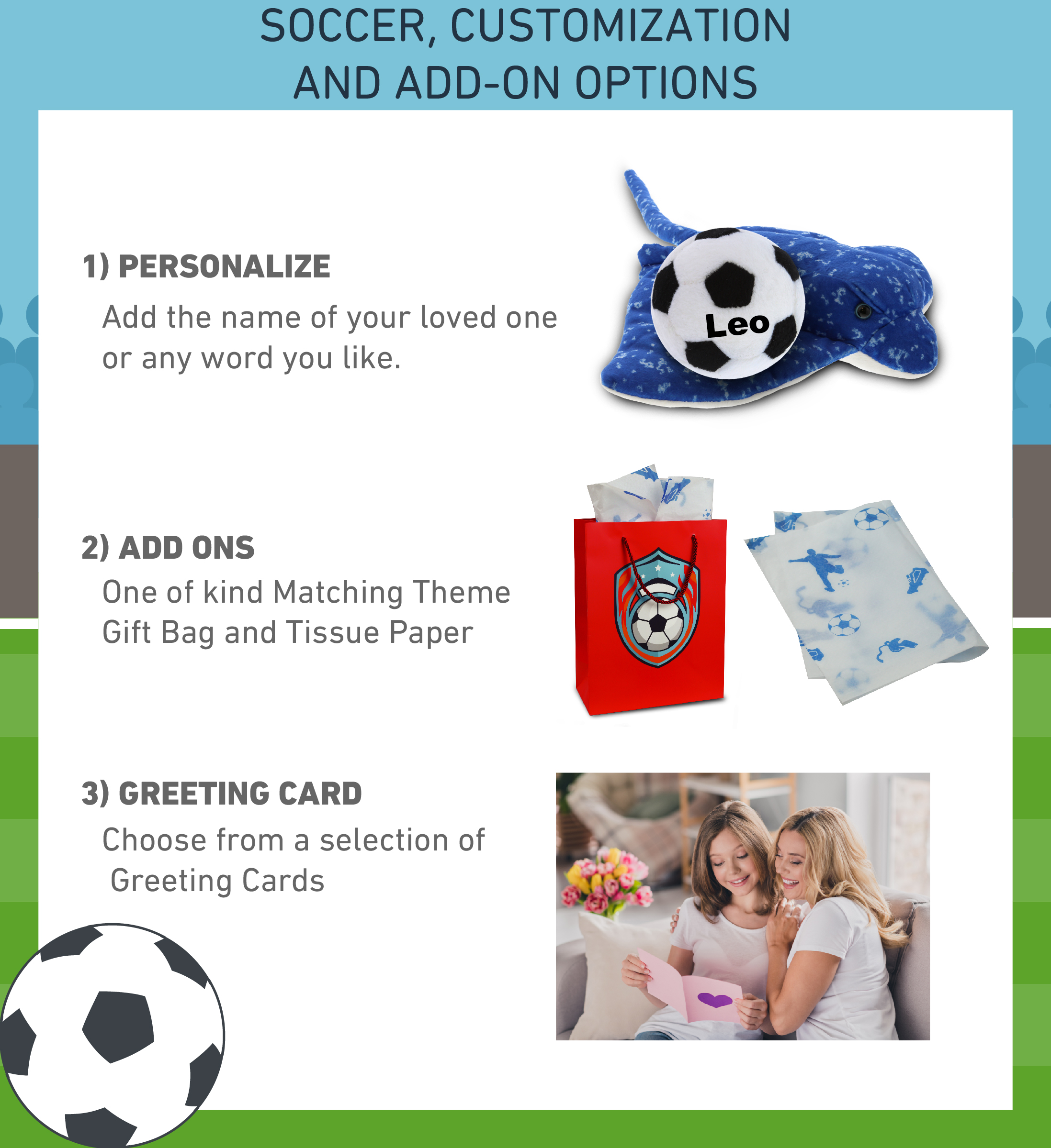 - PERSONALIZATION, CUSTOMIZATION, AND ADD-ON OPTIONS – Super Soft Sports Stuffed Animal Spotted Blue Ray comes customized with a Soccer Ball Plush. You can personalize it with the name of your loved one imprinted on the item. You also have the option to add some or all of the cool add-ons to make your gift extra special: 1) Gift Bag; 2) Tissue Paper; 3) Greeting Card.