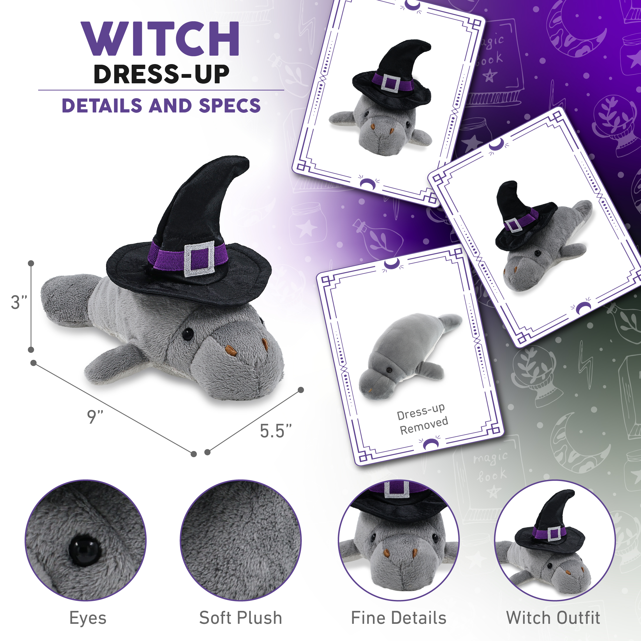 - Includes 1 DolliBu Super Soft Plush Grey Manatee Toy Dressed in Witch Costume – The plush grey manatee arrives with a witch stuffed animal costume outfit hat. The witch stuffed manatee toy features a black witch dress up hat with intricate purple details. The perfect manatee plush to add spooky vibes to a display, along with other Halloween stuffed animals. A cute stuffed animal that measures 9Lx5.5Wx3H inches, for anyone ages 3 and up.