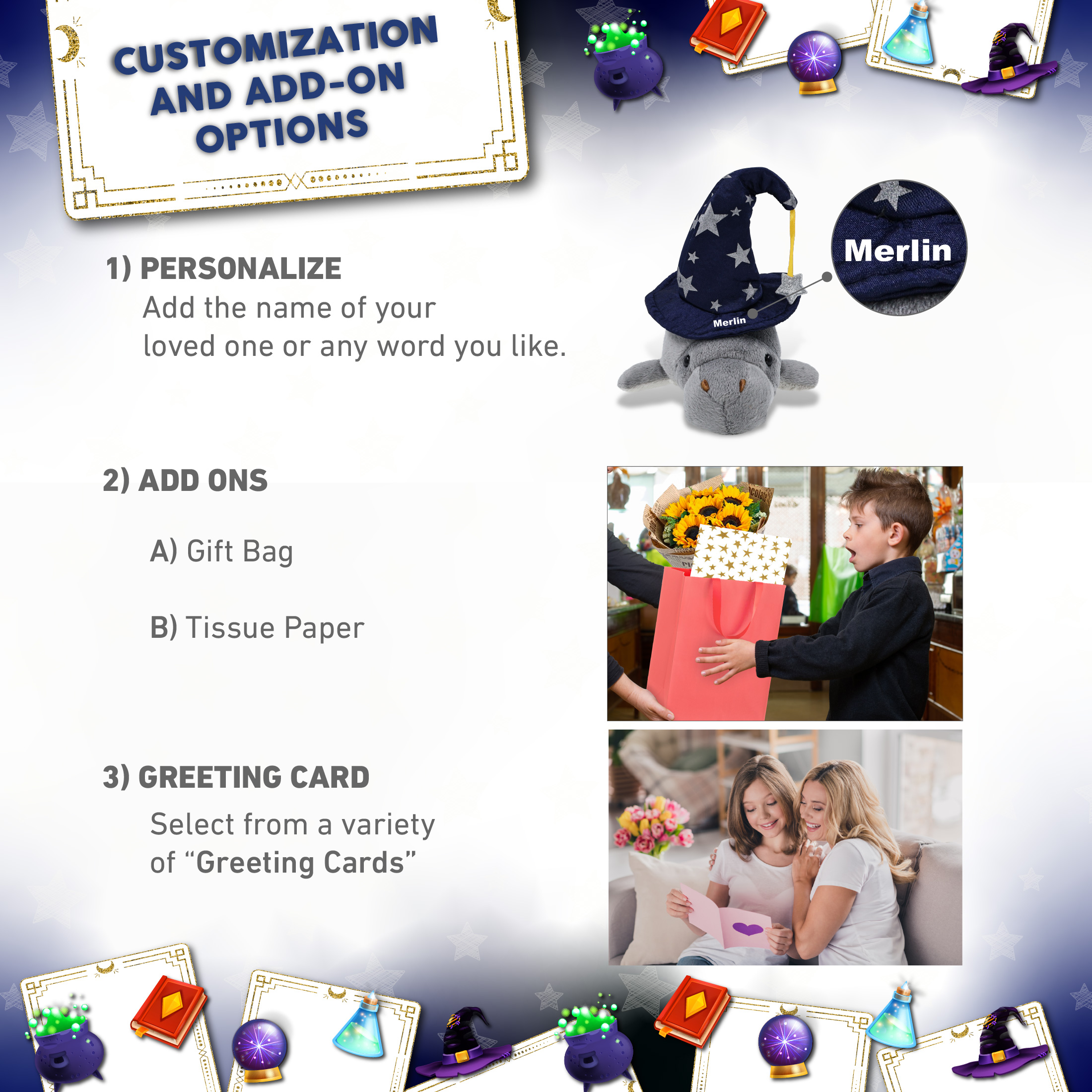 - Personalization, Customization, and Add-On Options – The manatee stuffed animal comes in an enchanting wizard hat with silver star details. Make your wizard stuffed manatee special by adding a personalized name, which we will imprint onto the plush. You can customize your plush wizard toy by adding any of our add-ons to create the perfect gift: 1) Gift Bag 2) Tissue Paper 3) Greeting Card.