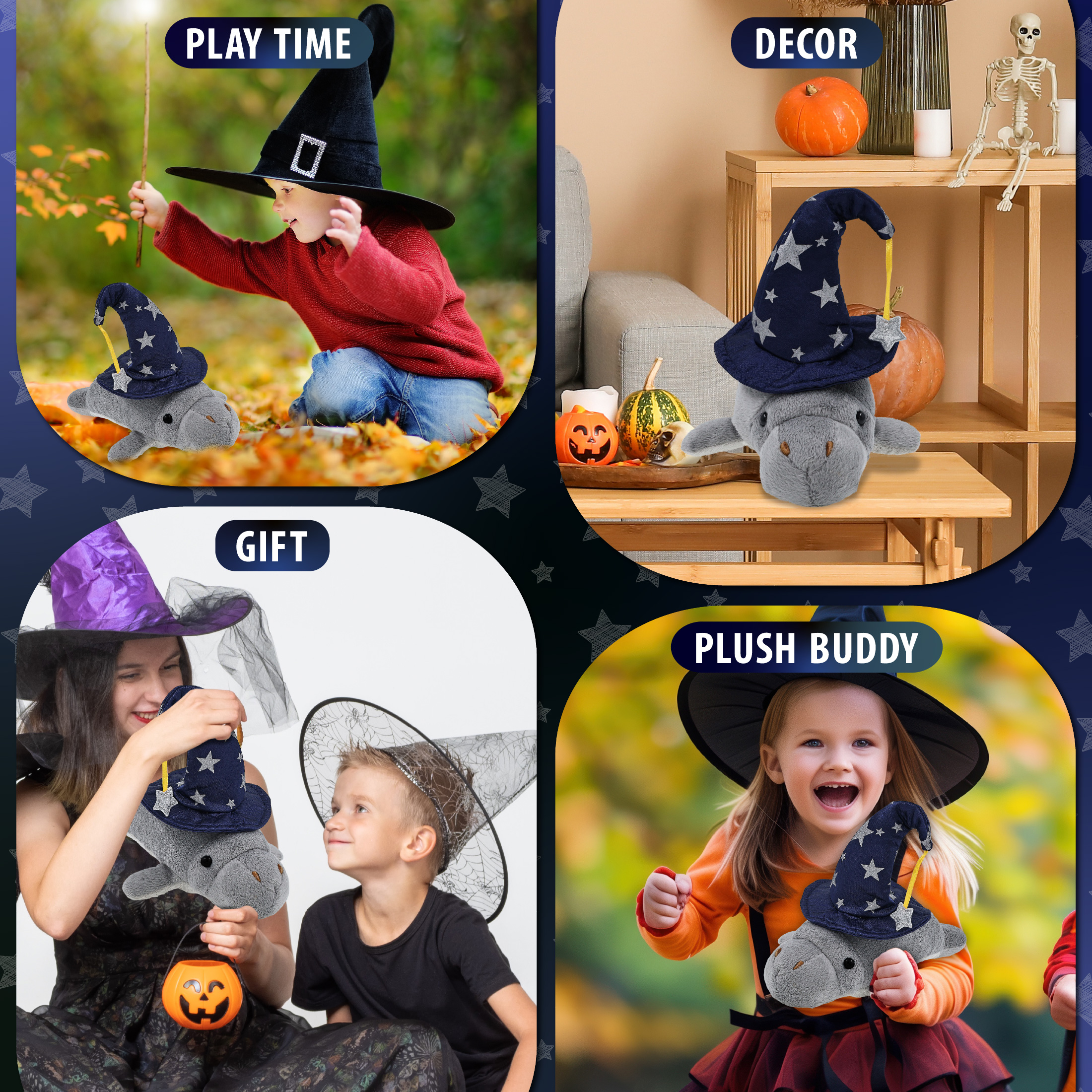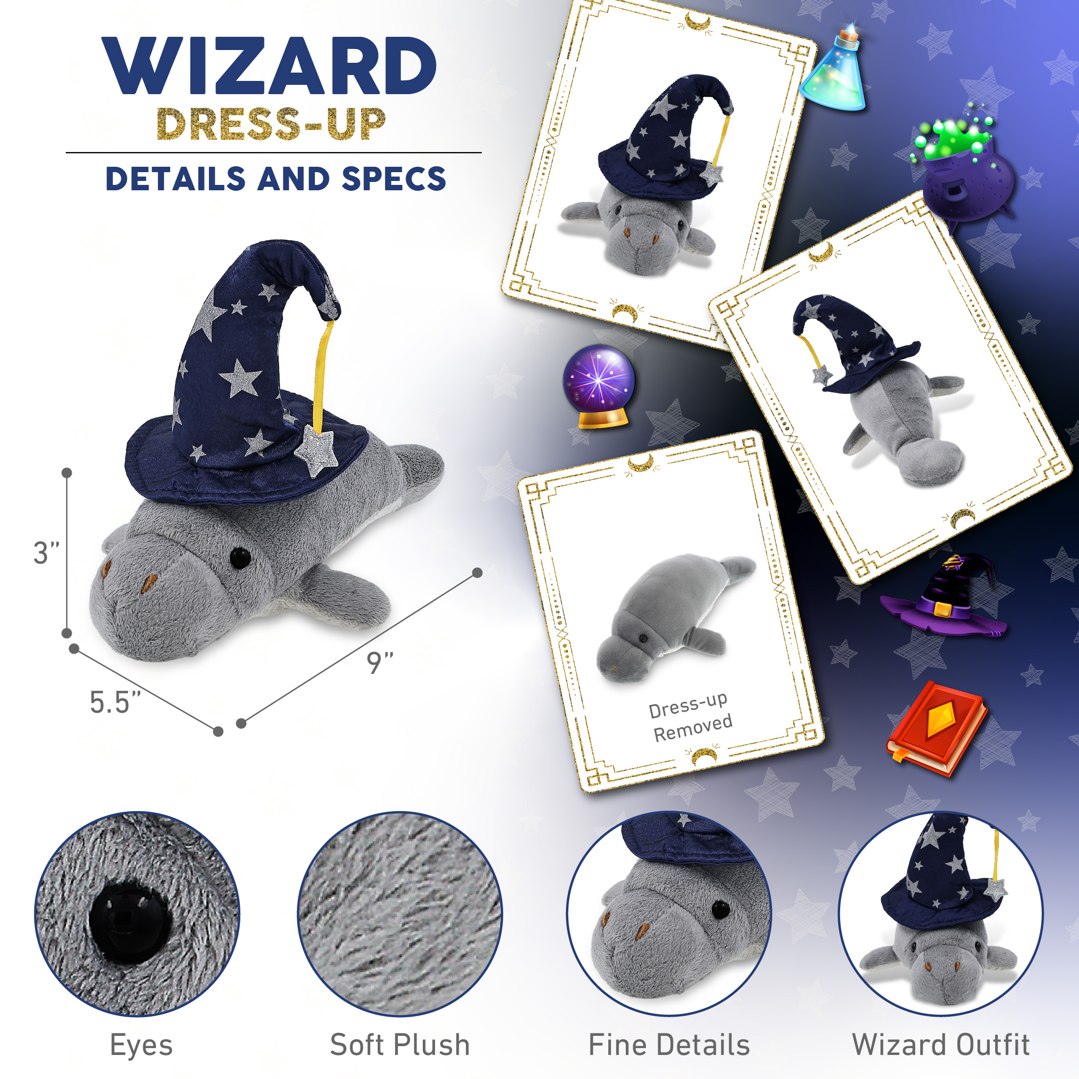 - Includes 1 DolliBu Grey Manatee Toy with Wizard Stuffed Doll Clothes – This plush manatee wild animal arrives in a magical wizard hat. Dressed in a blue wizard hat, this soft plush animal stands out in any wizard toy collection. It’s a great manatee gift for Halloween or birthdays. The wizard doll’s hat is securely stitched to the plush, ensuring safe and lasting playtime. This cute manatee plush wizard buddy measures 9Lx5.5Wx3H inches.