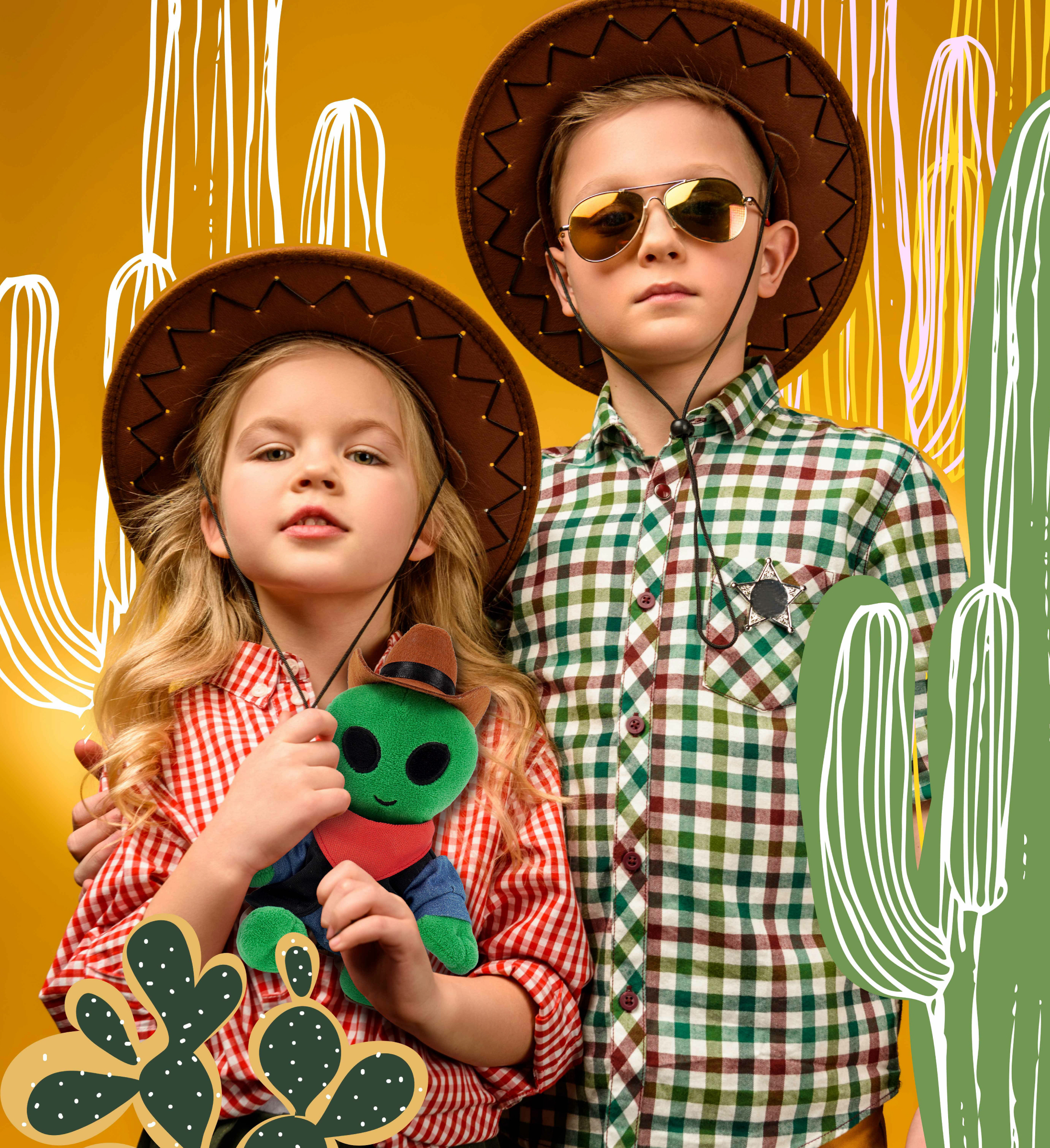 - Green Alien with Western Outfit Features Realistic Details From its Cowboy Hat to Leather Chaps – From its doll cowboy hat to detailed western outfit, this alien figure rocks a look that’s both fun and stylish. The combo of alien toy and cowboy accessories creates two playful themes: outer space and the Wild West. The plush alien with cowboy bear outfit makes the perfect addition to your collection of plush toys and cool stuffed animal clothing.