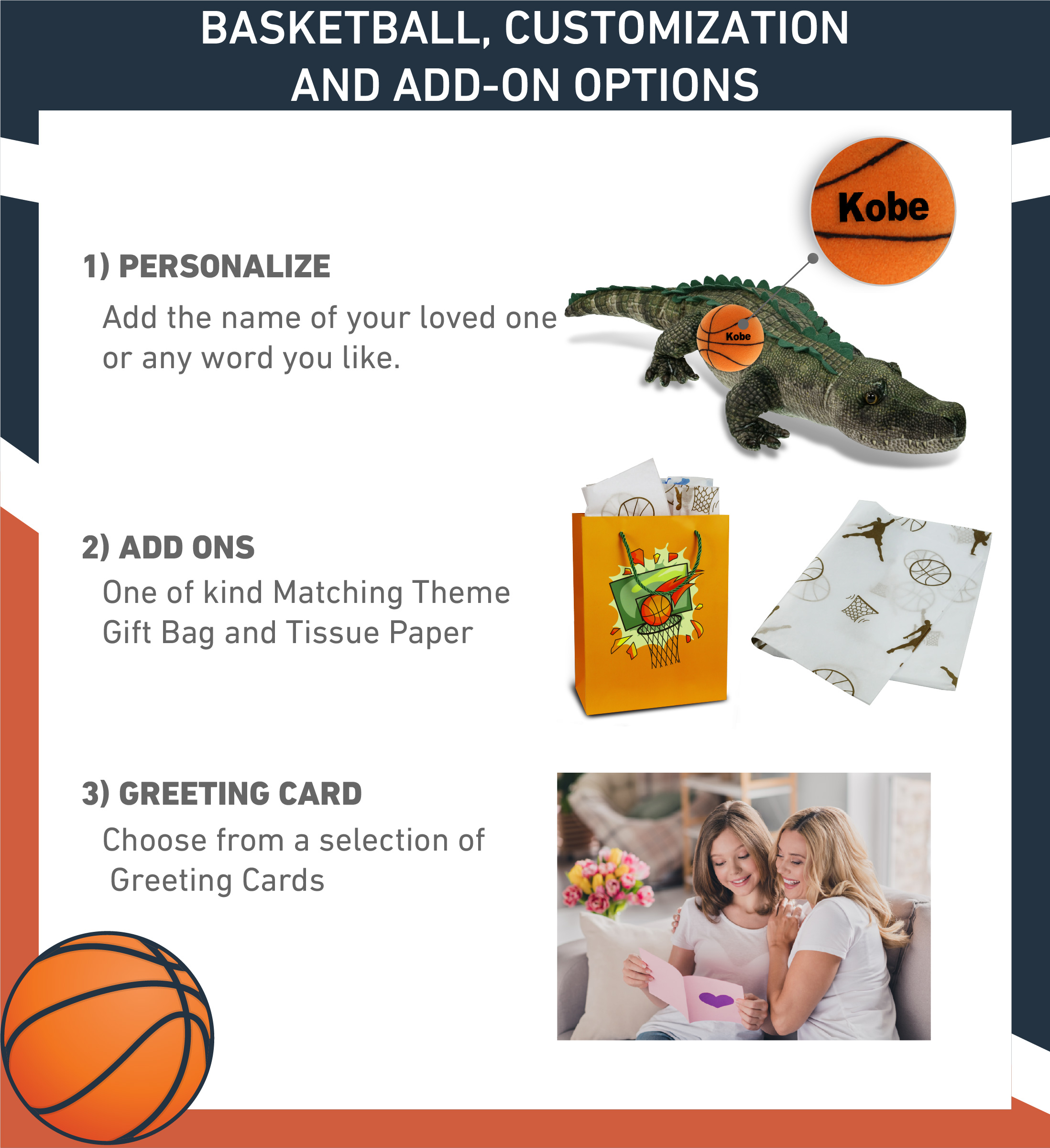 - Personalization, Customization, and Add-On Options – The Wild Collection Alligator Sports Stuffed Animal comes customized with a Basketball Plush. You can personalize your alligator plush toy with the name of your loved one, which we will imprint on the item. You also have the option to add some or all of the cool add-ons to make your plush gift extra special: 1) Gift Bag; 2) Tissue Paper; 3) Greeting Card.