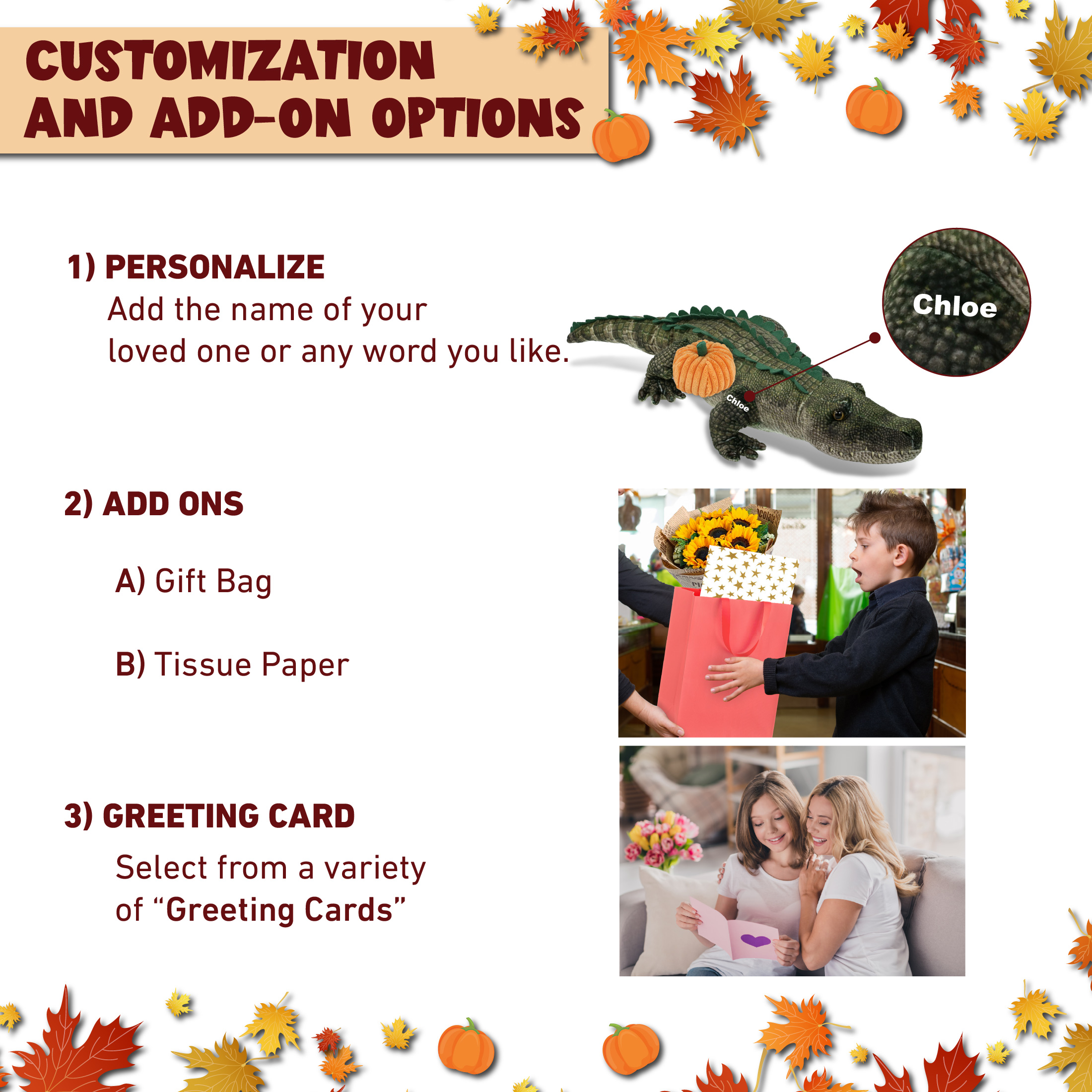 - Personalization, Customization, and Add-On Options – The Wild Collection Alligator Halloween stuffed animal comes customized with a small pumpkin plush toy. You can personalize your Alligator plush it with the name of a loved one or add any word which we will imprint on the item. You also have the option to add some or all of the cool add-ons to make your gift extra special: 1) Gift Bag 2) Tissue Paper 3) Greeting Card.