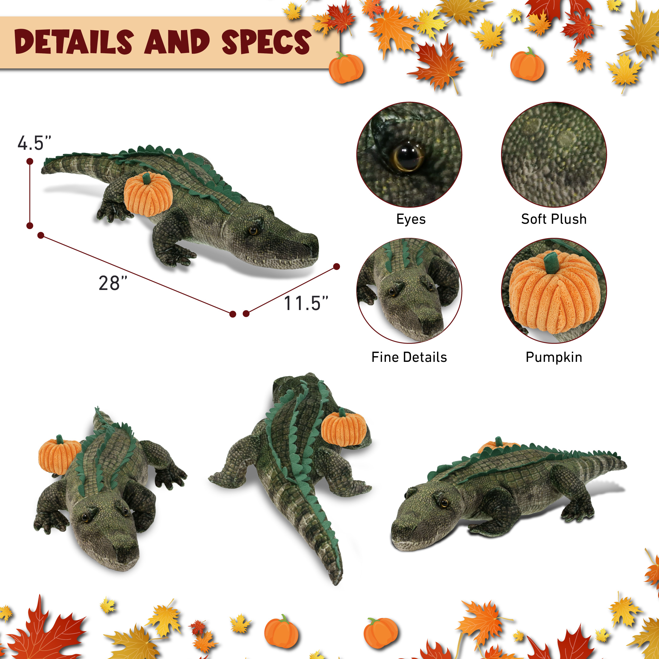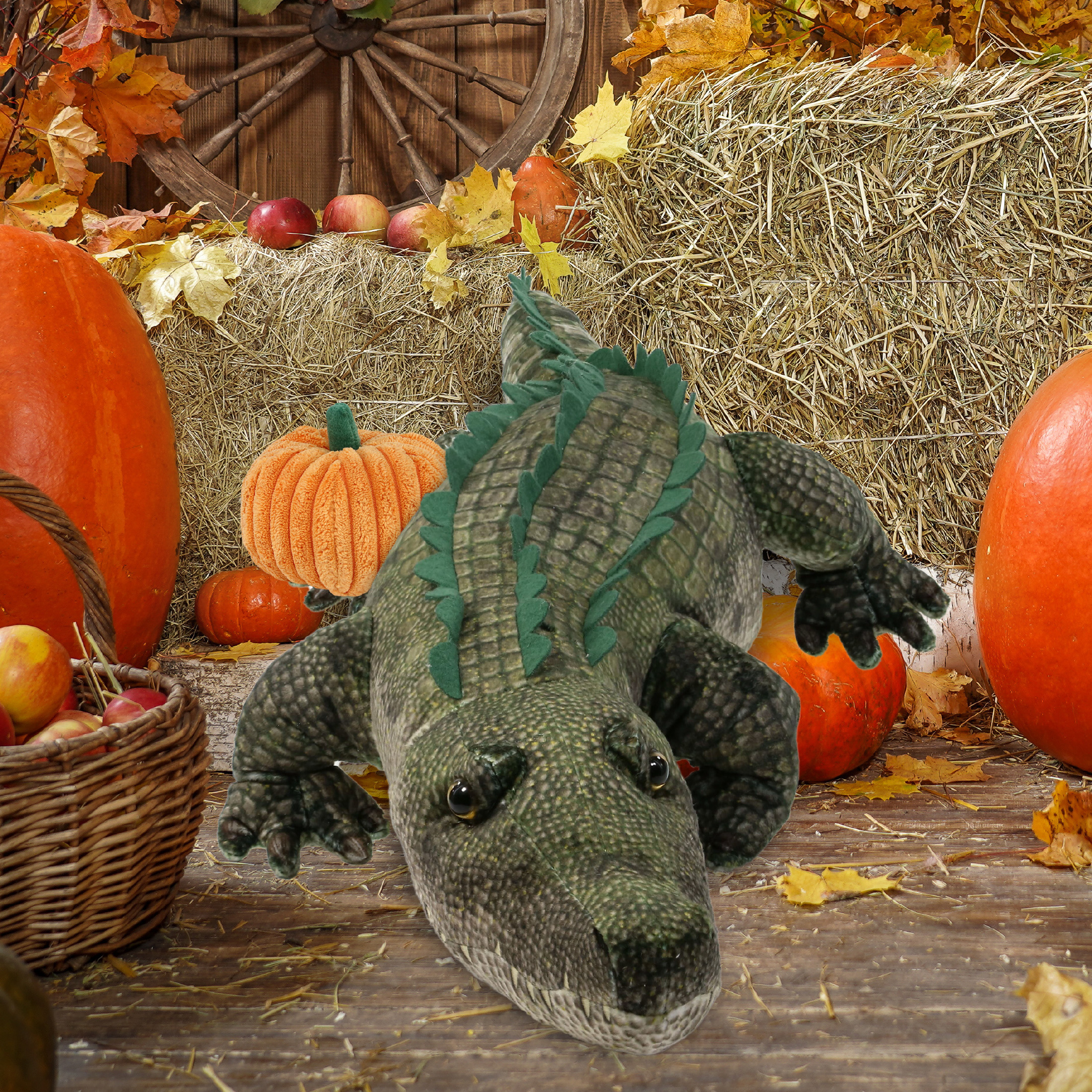 - Included in the Purchase of the Pumpkin Stuffed Alligator Plush – Includes 1 DolliBu Wild Collection Alligator Stuffed Animal Plush to celebrate fall season. The alligator features realistic details, and an orange plush pumpkin decor toy on the plush alligator animal’s side. Decorated with unique green plush, realistic design, and soft fabric, it is perfect for cuddles and snuggles. Gator plush animal measures 28Lx11.5Wx4.5H inches.