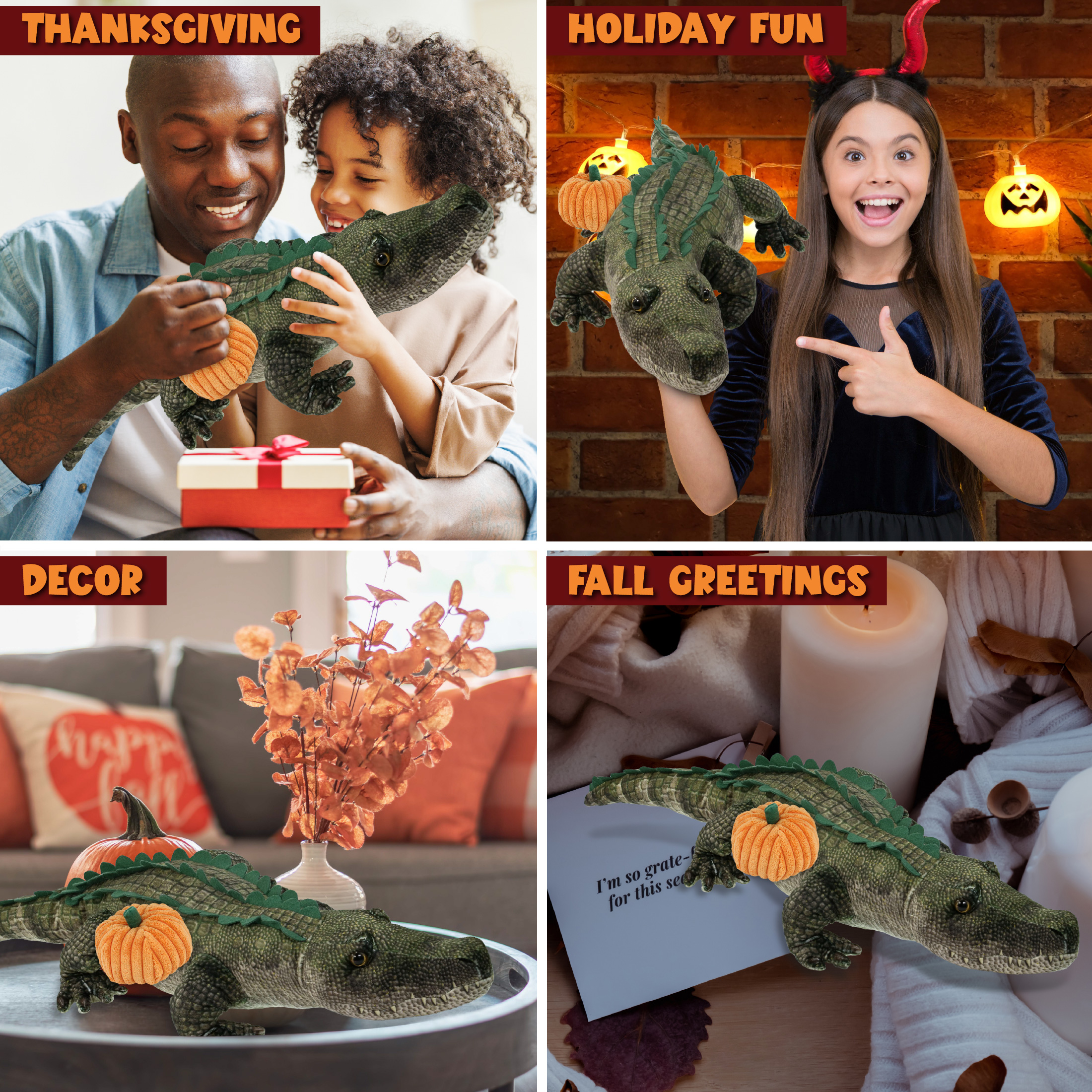 - The Alligator Pumpkin Plush Toy Is for Everyone Who Loves Halloween Toys – The wild collection alligator stuffed animal pumpkin plush toy designed with fall plush theme makes for sweet Halloween kids gifts, babys first Halloween gift and Thanksgiving gifts for friends and family. Welcome spooky month and share the fun of trick-or-treating with loved ones by gifting them a cute custom stuffed animal gator plush with a pumpkin soft toy.
