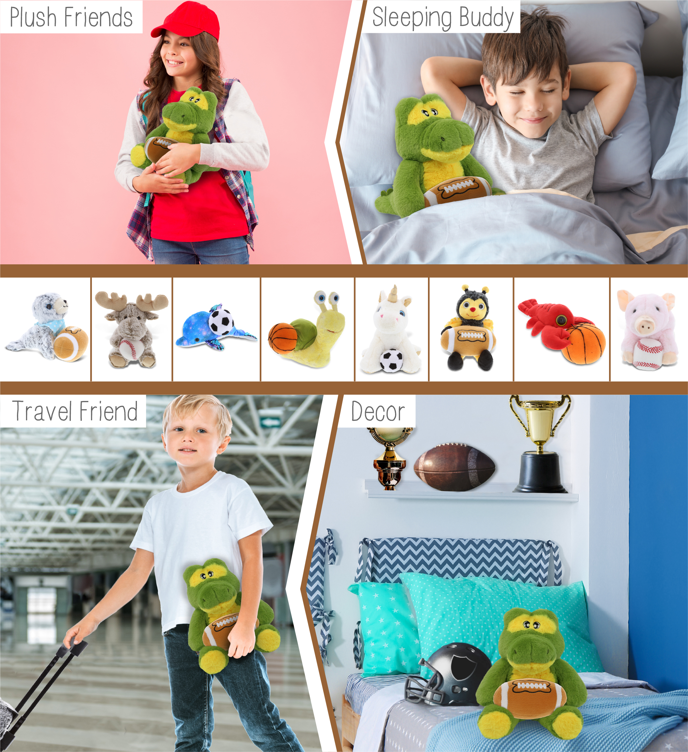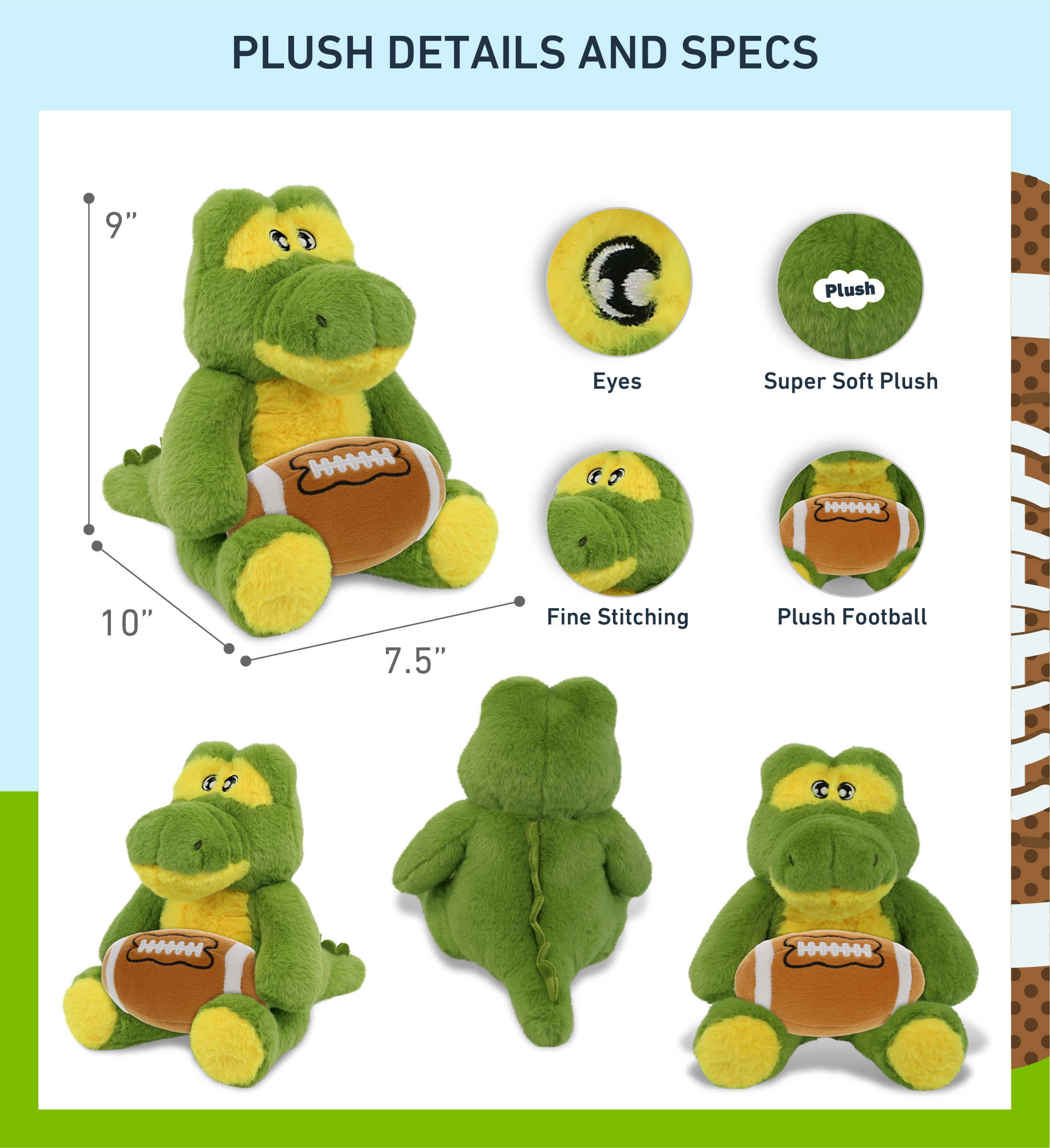 - Included with the Purchase of Adorable Cute Alligator Plush – Includes 1 DolliBu Super Soft Eco-Friendly Alligator with a football plush, decorated with realistic features of a cute alligator. The body with a sports gift ball plush makes the plush perfect for cuddles. The alligator plush toy features its iconic snout. The alligator’s eyes make the critter so charming. The cute alligator plush toy buddy measures 10Lx7.5Wx9H inches.