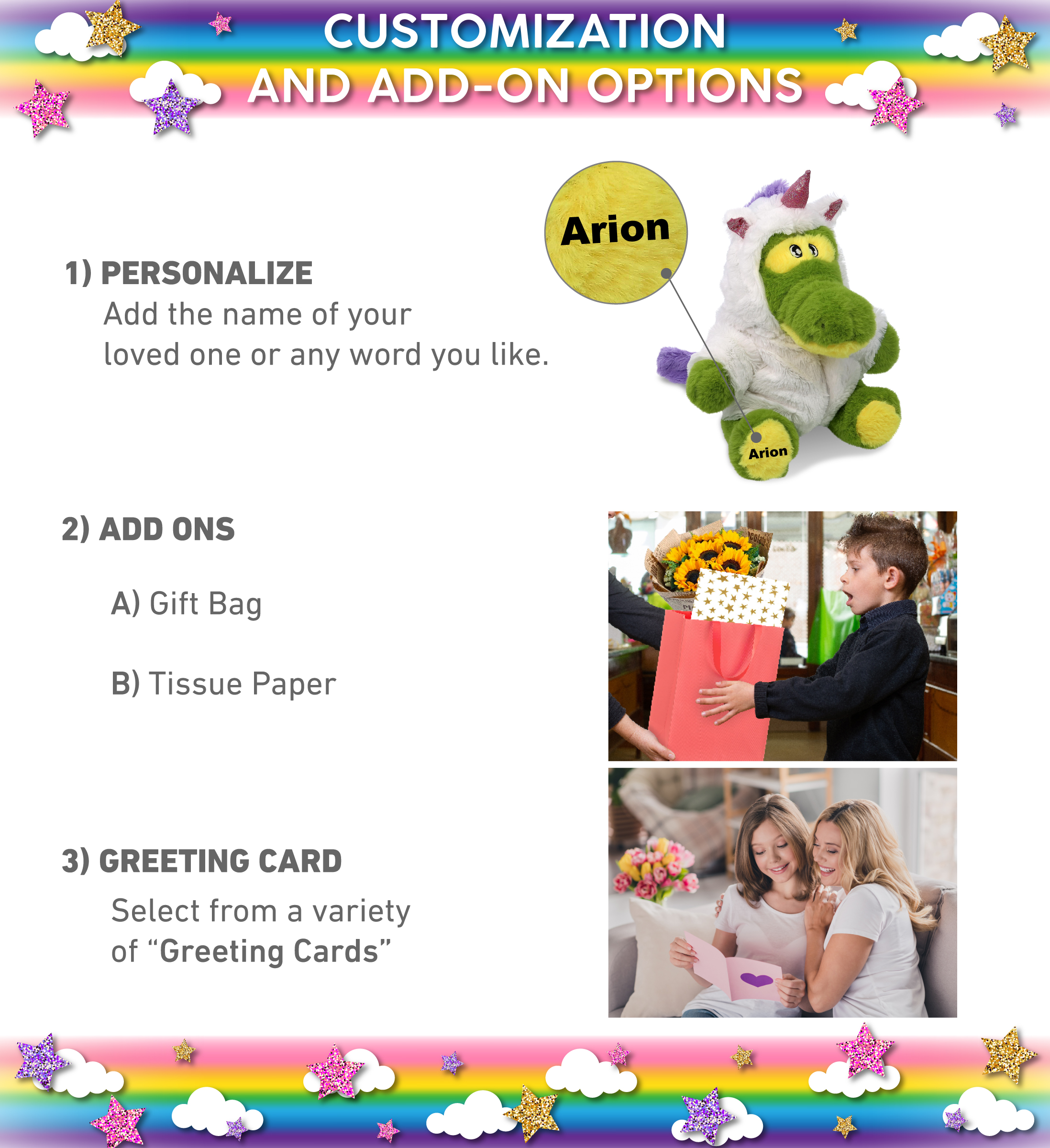 - Personalization, Customization, And Add-On Options – The Super Soft Plush Eco-Friendly Alligator Unicorn Stuffed Animal comes customized with a white unicorn outfit. You can personalize it with the name of your loved one, and we will imprint it on the item. You also have the option to add some or all of the cute add-ons to make it extra special: 1) Gift Bag; 2) Tissue Paper; 3) Greeting Card.