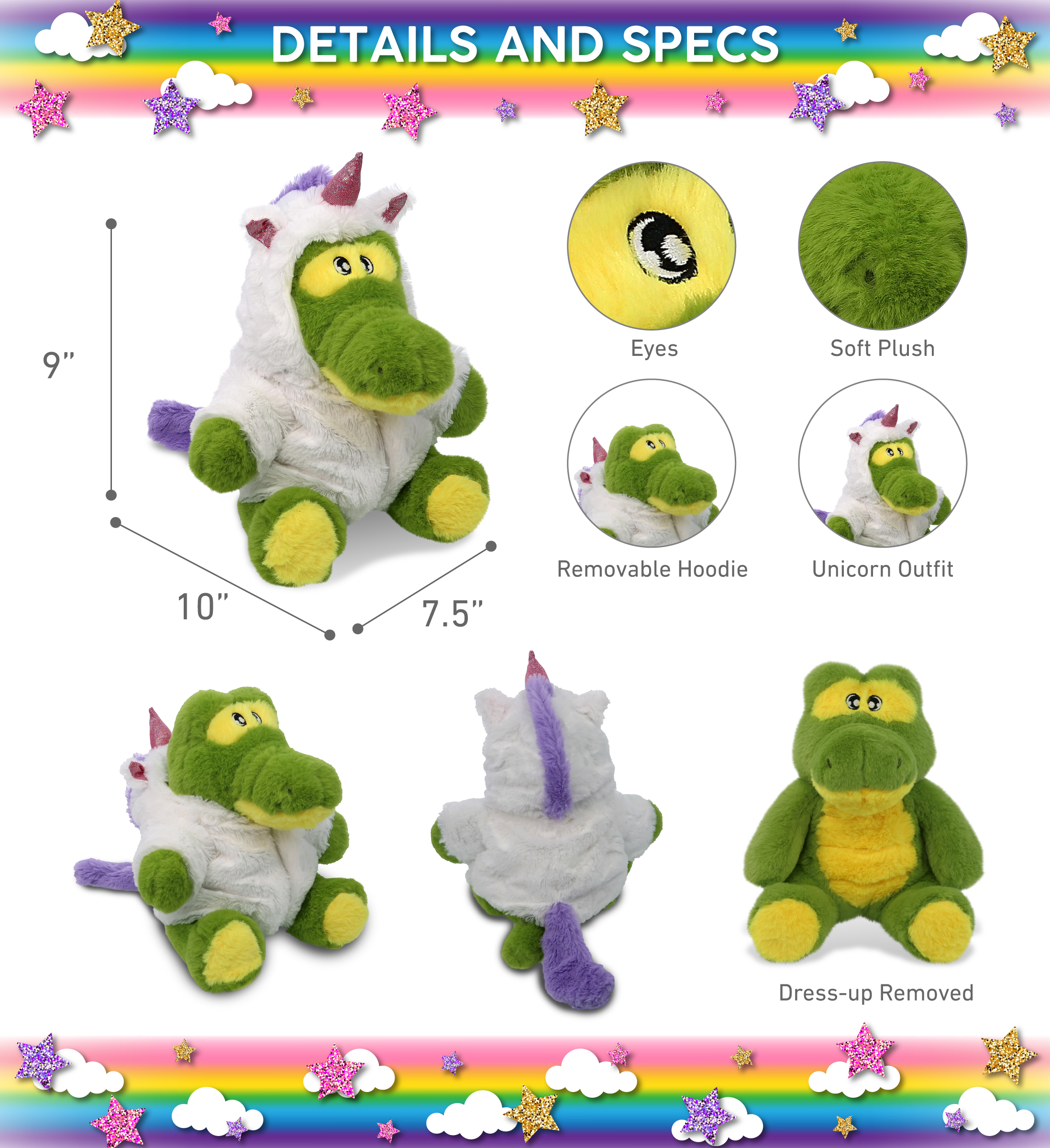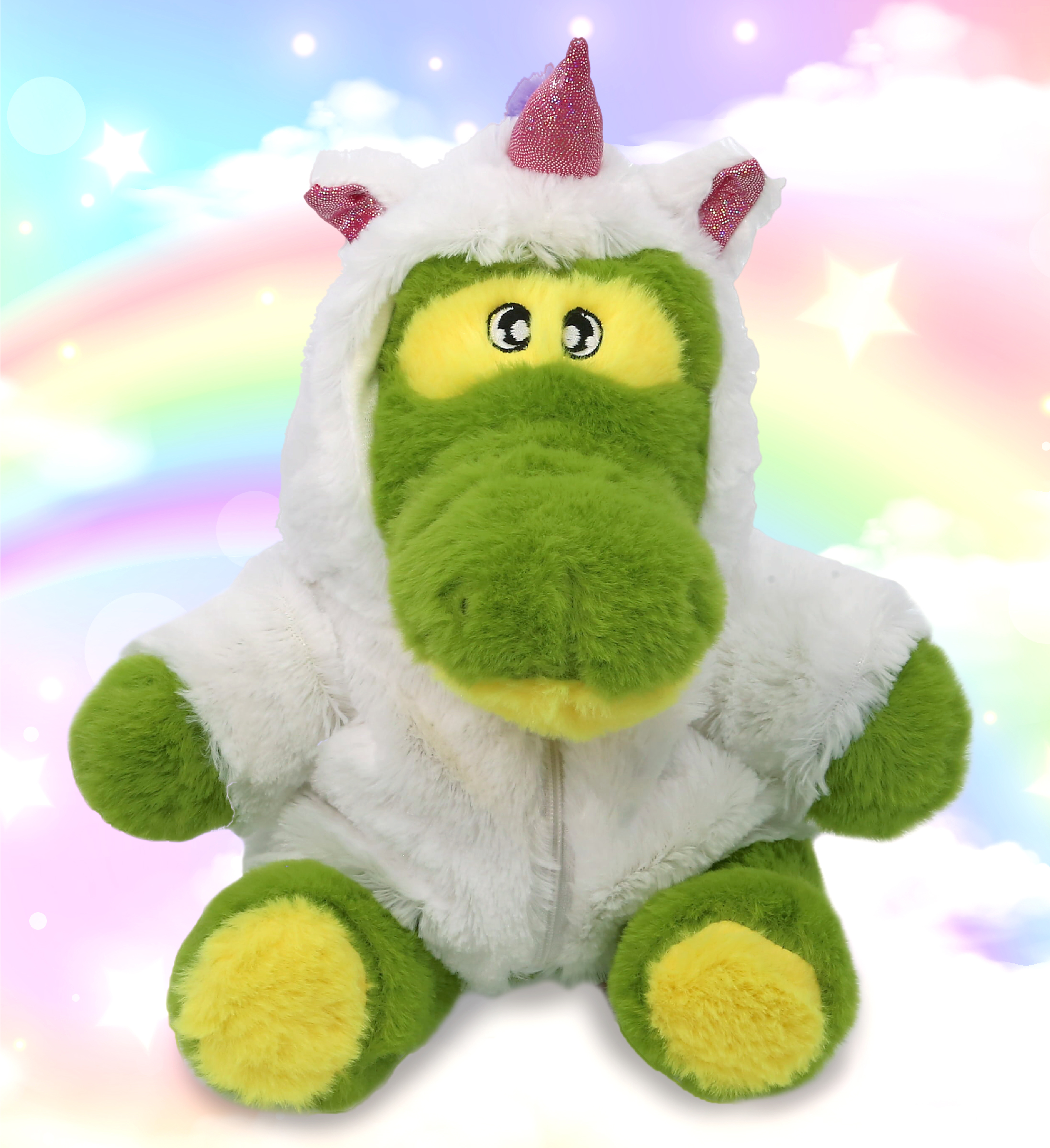 - Included with The Purchase of the Unicorn Dress Up Plush Stuffed Animal – Includes 1 DolliBu Eco-Friendly Alligator Unicorn Plush measuring 10Lx7.5Wx9H inches. The Alligator Unicorn plush fantasy comes with a removable white unicorn costume with sparkling pink horn and ears embedded with glitter. Add the Alligator Unicorn to your kid’s unicorn collection of plush animals for pretend play and snuggle when taking nappies to keep them cozy.