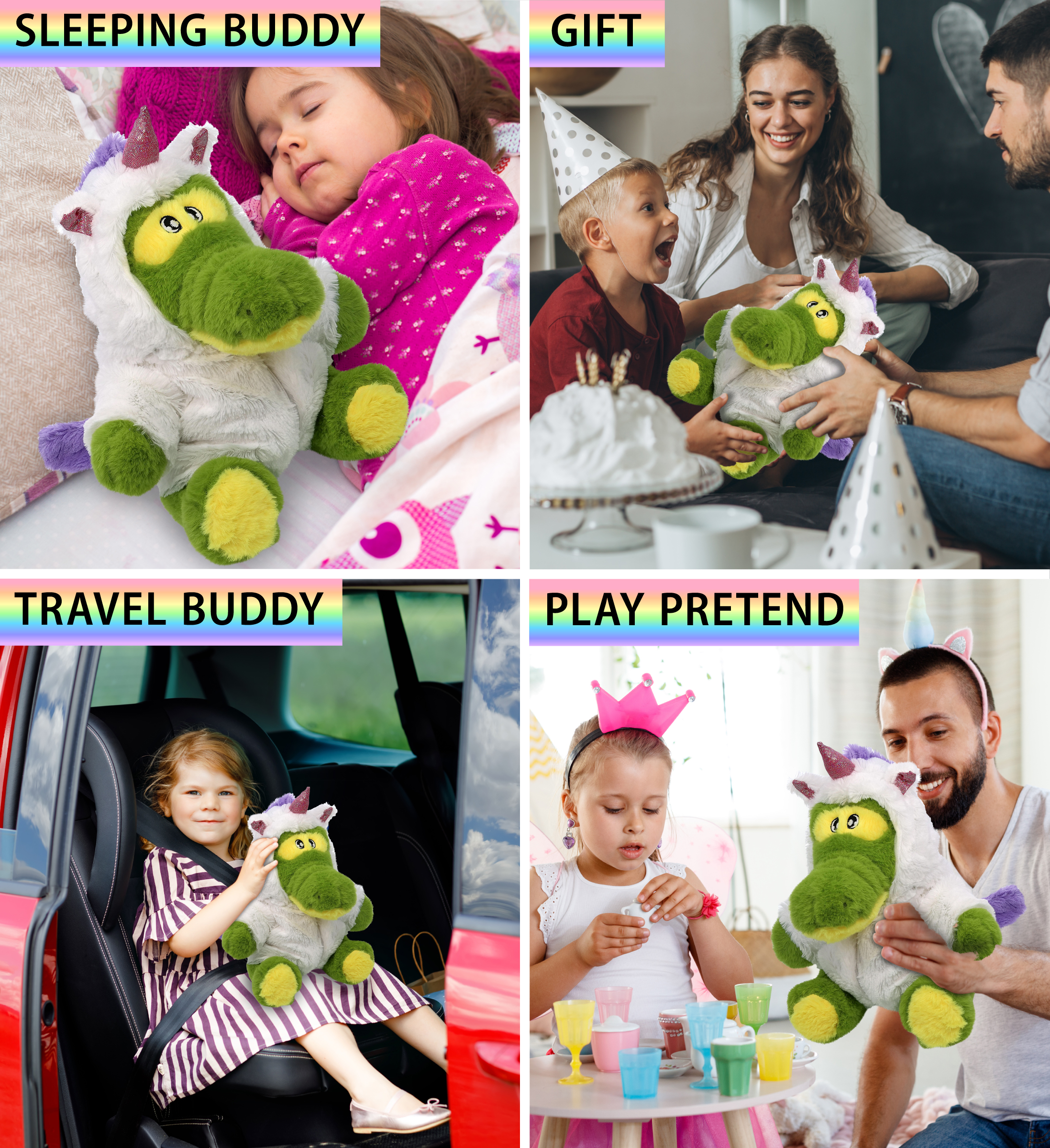 - Ideal Use for The Unicorn Stuffed Toy Plush – Make your kid’s day by surprising them with an Eco-Friendly Alligator Unicorn Stuffed Animal! Fluffy and cute, the Unicorn Alligator puts a twist on your usual unicorn plush and makes an amazing addition to your kids collection of unicorn-stuffed toys. Kids will love dressing up Alligator Unicorn and playing pretend. This stuffed Unicorn dress-up plush toy makes a great sleeping and travel buddy.