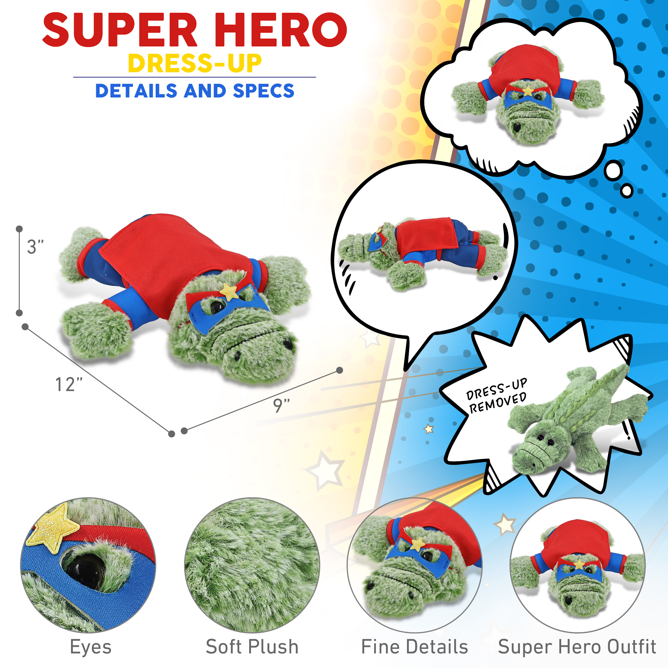 - Made of High-Quality Polyester – The alligator plush superhero toy is made with super-soft, premium-quality polyester materials. The alligator plush stuffed animal is designed for everyday hugs and dress-up fun. The teddy bear superhero is a fun option for fans of super hero toys and save-the-day adventures. The superhero plush toy outfit includes a hook and loop tape fastener on the back of the suit for dressing.