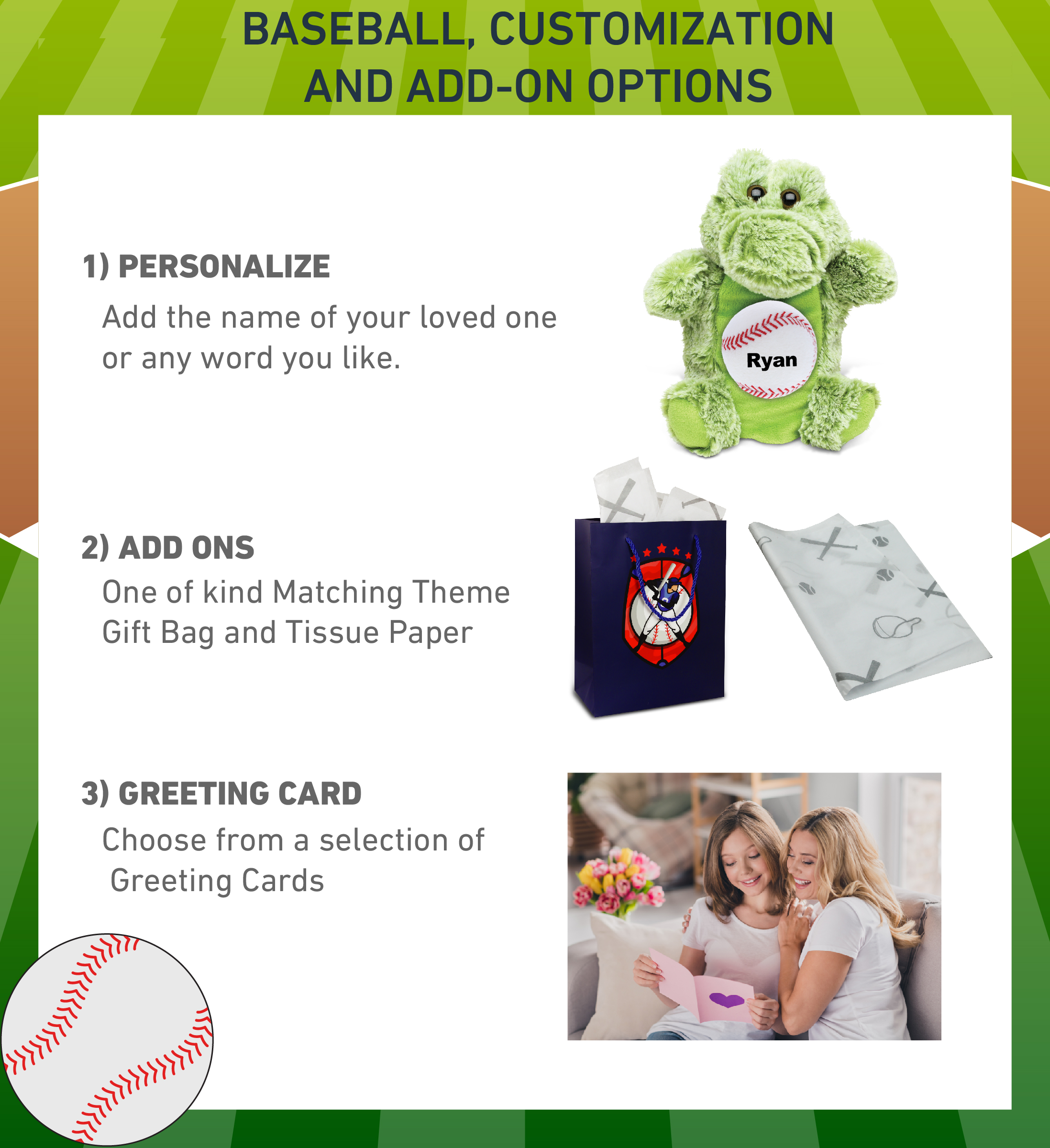 - Personalization, Customization, and Add-On Options – The Super Soft Sports Stuffed Animal Alligator Plush Hand Puppet comes customized with a small baseball plush. You can personalize your stuffed animal alligator with the name of your loved one which we will imprint on the item. You also have the option to add some or all of the cool add-ons to make your gift extra special: 1) Gift Bag; 2) Tissue Paper; 3) Greeting Card.