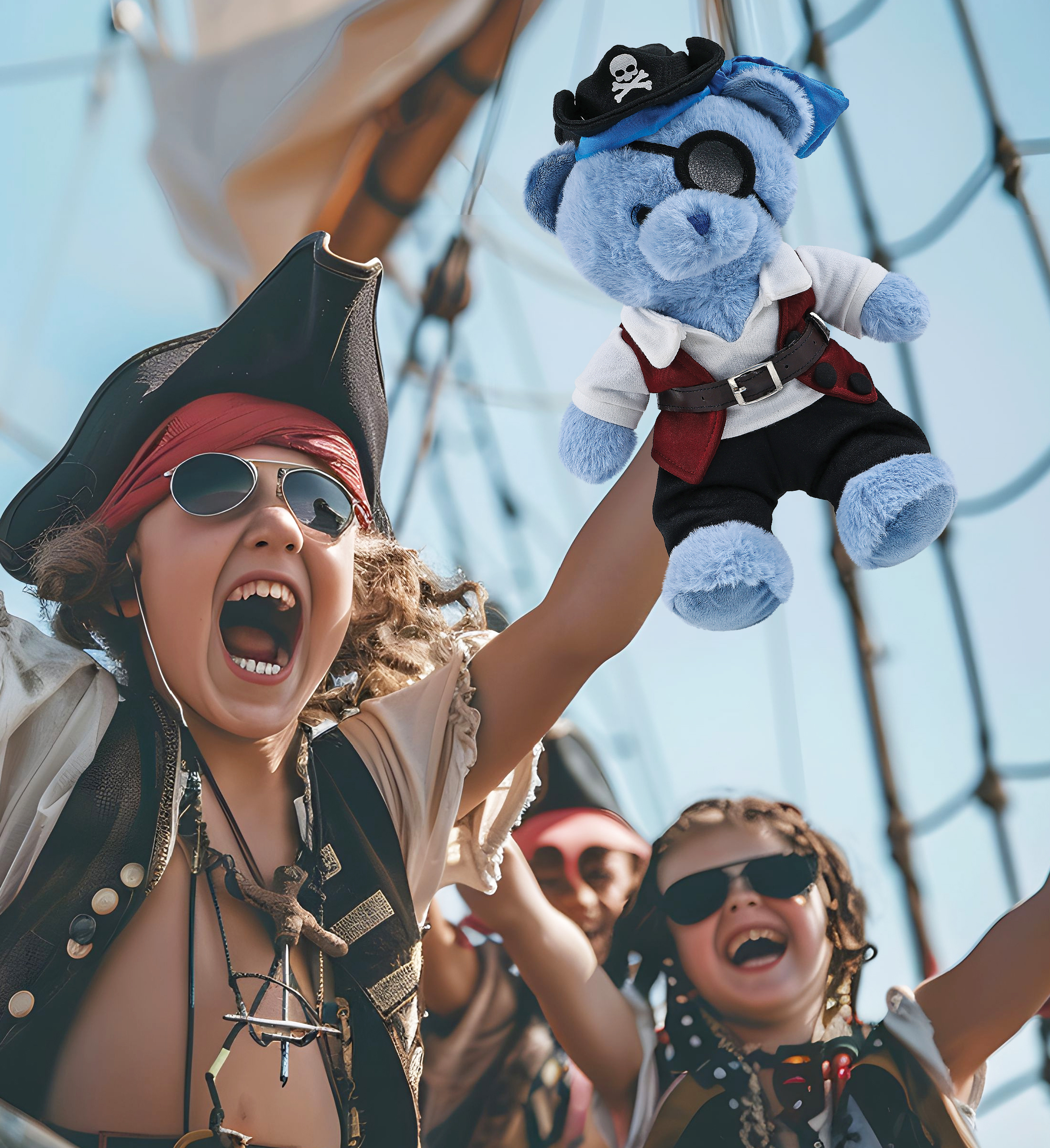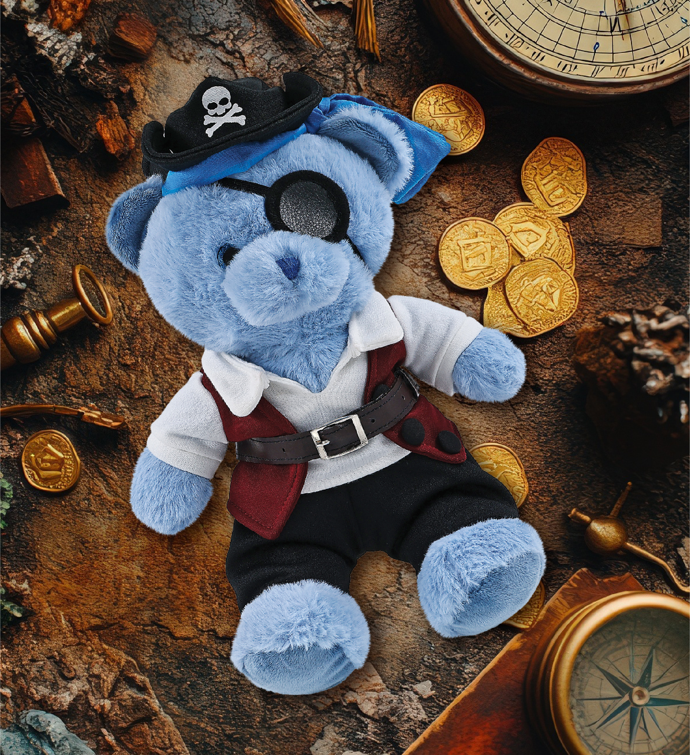 - The Pirate-Themed Baby Blue Bear Stuffed Animal Features a Fun Mix of Pirate Vibes and Classic Bear – Making it both quirky and lovable. It comes with a complete head-to-toe pirate teddy bear outfits, featuring a hat with skull print and a blue bandana, a red vest, black pants, brown belt, white shirt, and an eye patch, making your cute Baby Blue Bear a complete pirate, ready for some wild animal sea pirate adventure