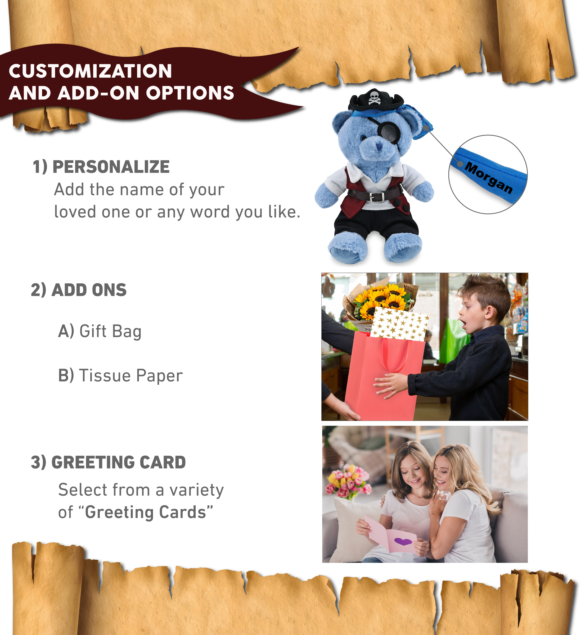 - Personalization, Customization, and Add-On Options – The blue bear figure stuffed toy comes dressed in full pirate clothes, complete with pirate hat, pirate vest, pirate shirt, pants, belt, and pirate mask. Make your bear doll special by adding a personalized name, which we will imprint onto the plush. You can also customize your stuffed animal by adding any of our add-ons to create the perfect gift: 1) Gift Bag 2) Tissue Paper 3) Greeting Card.