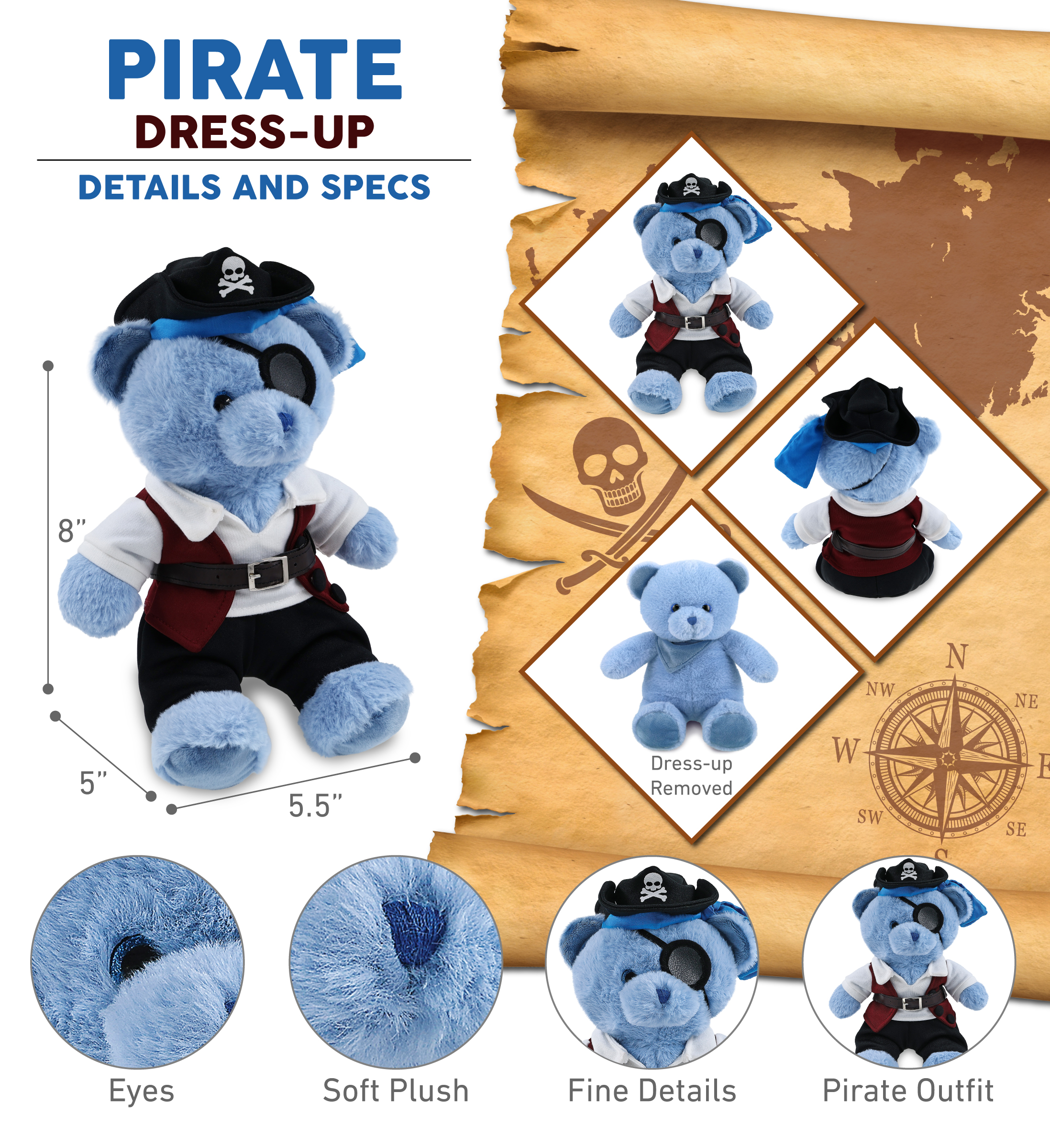 - Includes 1 DolliBu Super Soft Baby Blue Bear Stuffed Toy with Pirate Outfit – The blue bear toy wears a pirate teddy bear costume featuring a pirate vest, belt, shirt, pants, and pirate hat. Whether you’re collecting bear toys or hunting for pirate stuff for kids, this plush is the perfect combo of silly plush fun and dress-up adventure. This cute pirate stuffed animal bear measures approximately 5.5Lx5Wx8H inches and is for kids ages 3 and up.