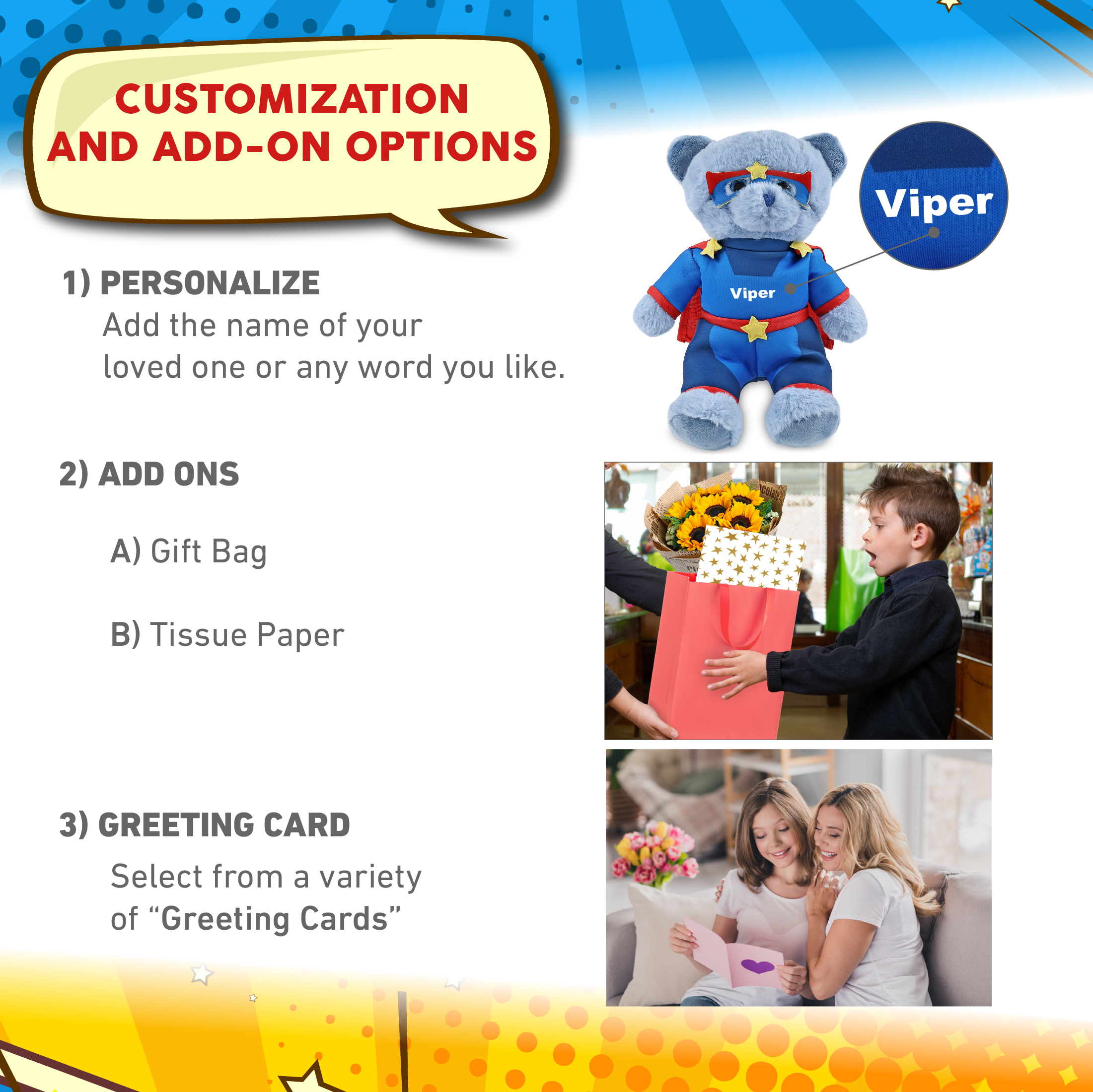 - Personalization, Customization, and Add-On Options – The blue bear stuffed animal comes dressed in a full superhero outfit, complete with eye mask, suit with cape, and star details. Make your super hero blue bear toy special by adding a personalized name, which we will imprint onto the plush. You can also customize your plush hero toy by adding any of our add-ons to create the perfect gift: 1) Gift Bag 2) Tissue Paper 3) Greeting Card.