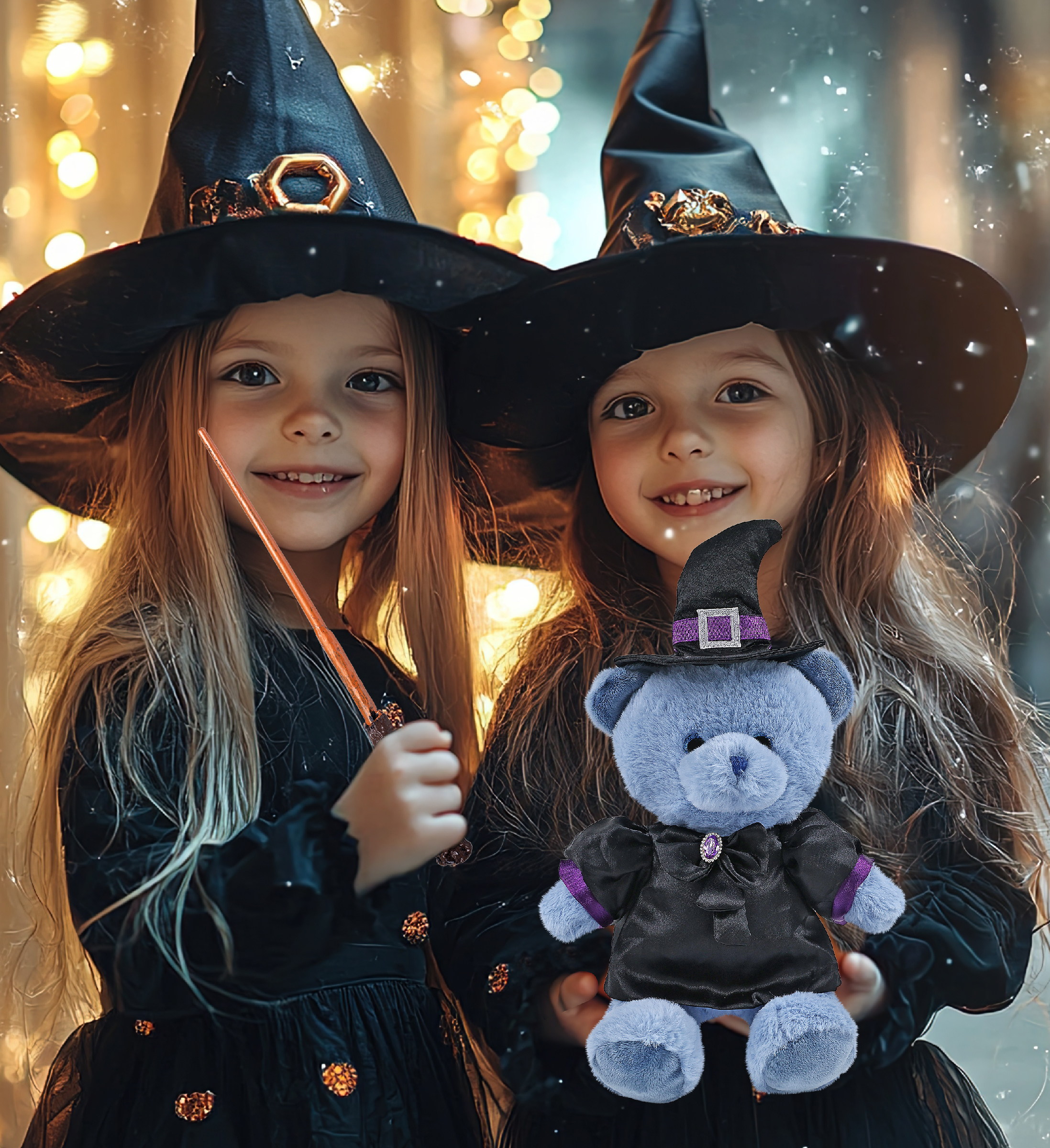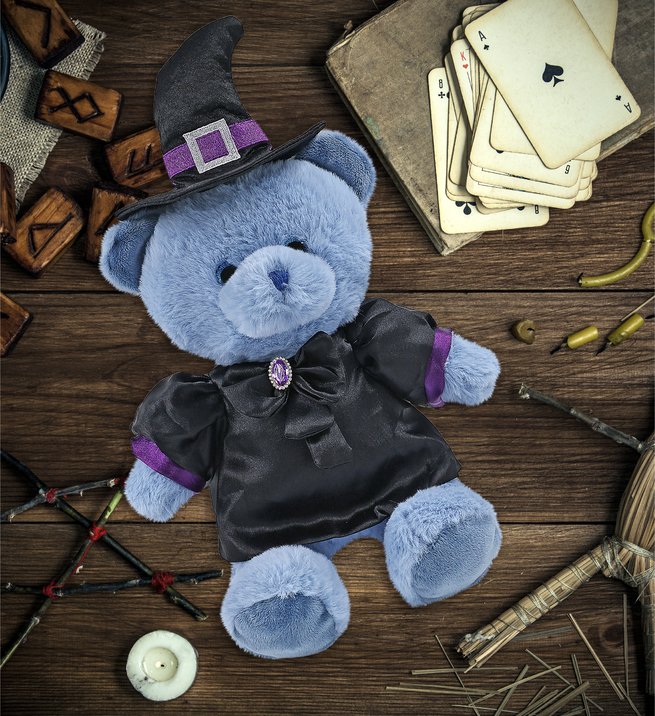 - Features a Teddy Bear Halloween Plush Wearing Witch Plush Doll Clothes – This cute witch blue bear stuffed toy comes dressed in a soft black satin witch doll dress with purple trim and a shiny gem-accented bow. It also wears a pointy black witch hat decor with a silver buckle and purple band, completing the spooky Halloween teddy bear look. The bear plush toy witch costume is removable and fits snugly on the bear Halloween witch doll.