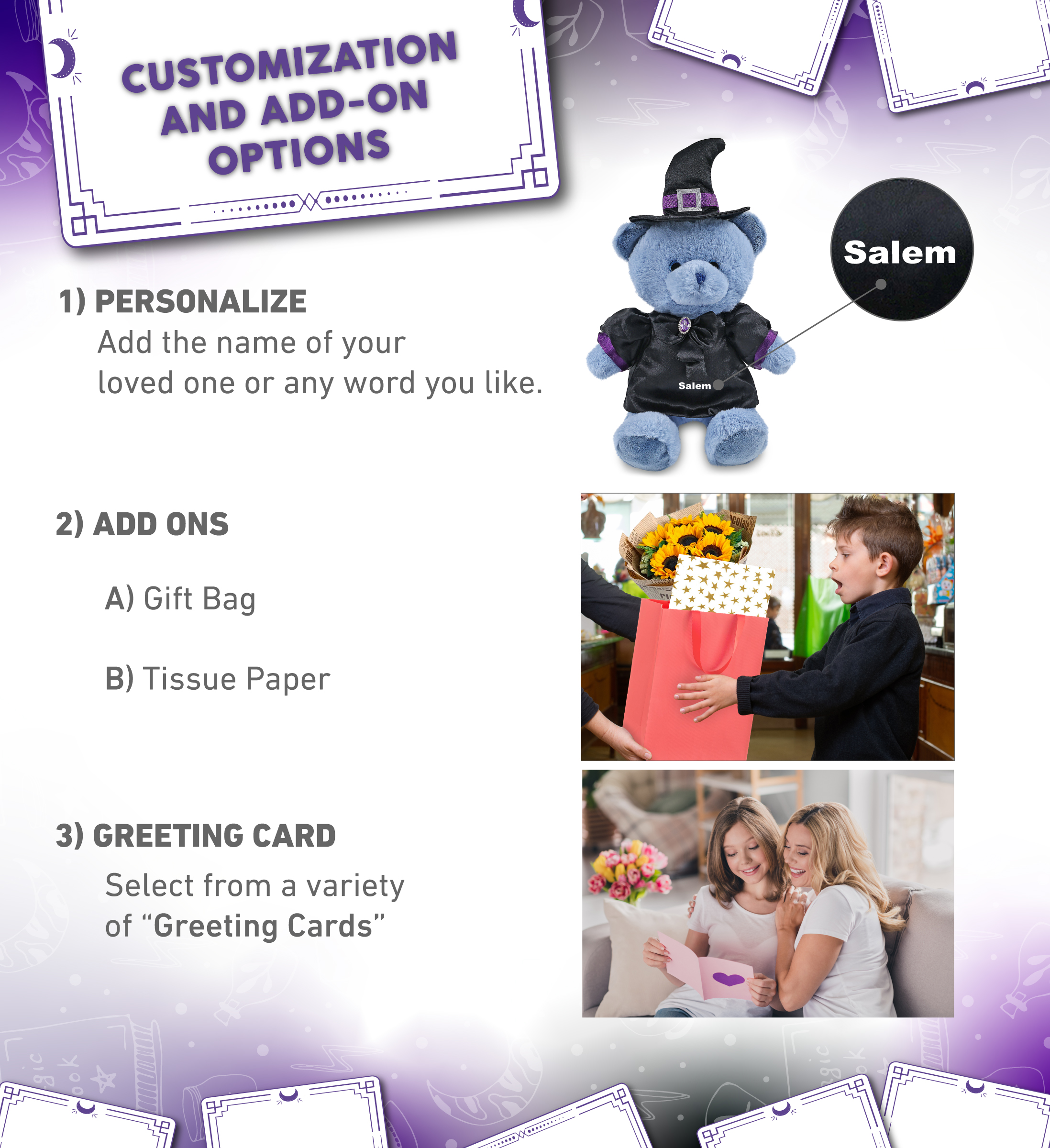- Personalization, Customization, and Add-On Options – The bear Halloween plush toy comes dressed in a witch outfit, complete with black and purple cloak and pointy black witch hat. Make your teddy bear doll special by adding a personalized name, which we will imprint onto the plush. You can also customize your witch bear stuffed animal by adding any of our add-ons to create the perfect gift: 1) Gift Bag 2) Tissue Paper 3) Greeting Card.