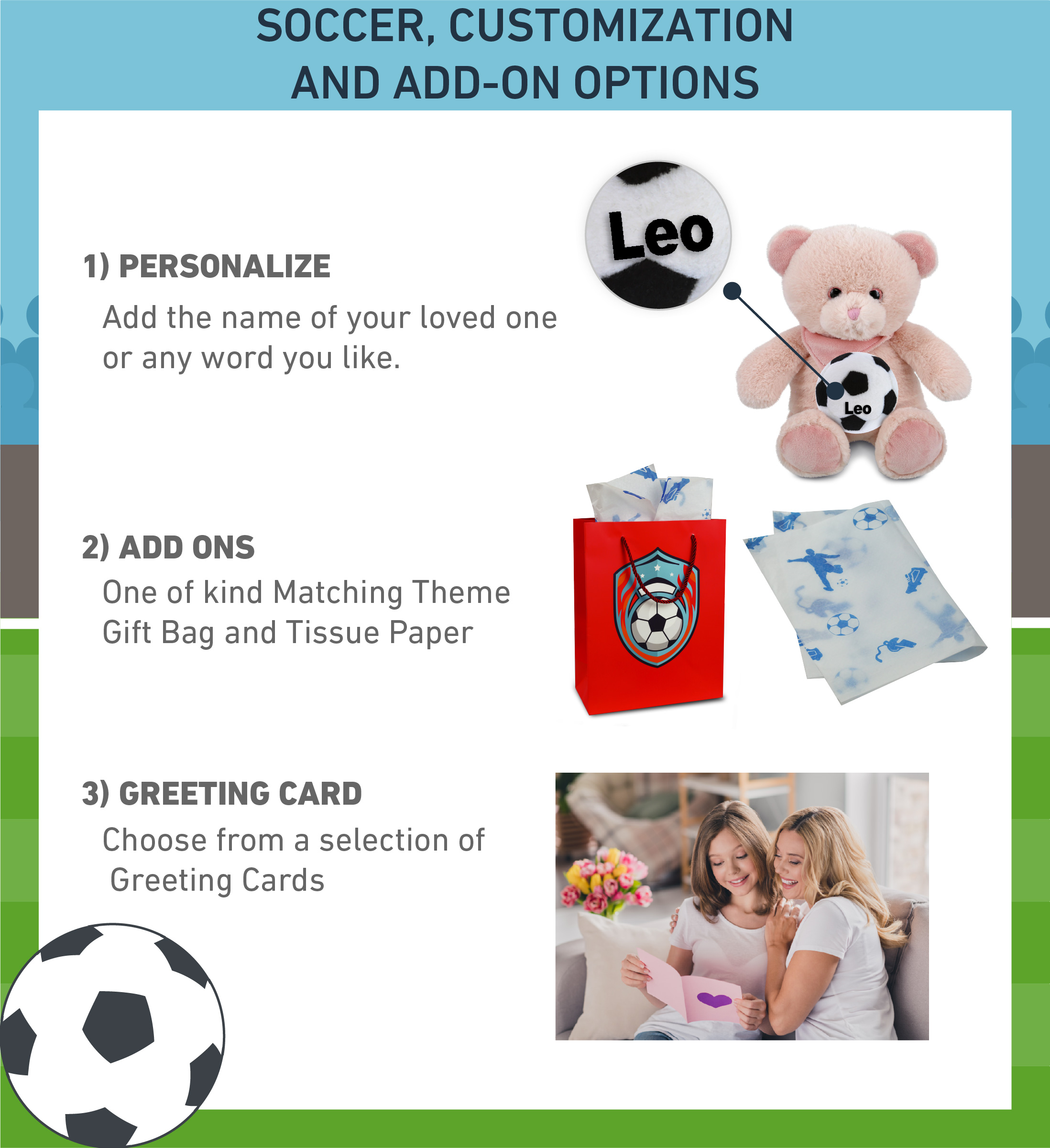 - PERSONALIZATION, CUSTOMIZATION, AND ADD-ON OPTIONS – Super Soft Sports Stuffed Animal Baby Pink Bear comes customized with a Soccer Ball Plush. You can personalize it with the name of your loved one imprinted on the item. You also have the option to add some or all of the cool add-ons to make your gift extra special: 1) Gift Bag; 2) Tissue Paper; 3) Greeting Card.