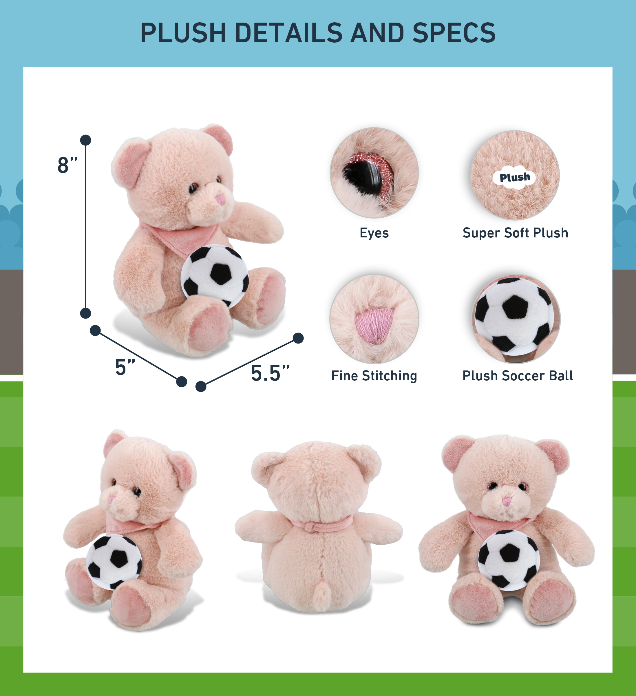 DolliBu Baby Pink Bear Stuffed Animal with Soccer Ball Plush – Soft Huggable Pink Bear, Adorable Playtime Plush Toy, Cute Teddy Gift, Super Soft Plush Doll Animal Toy for Kids and Adults – 8 Inches