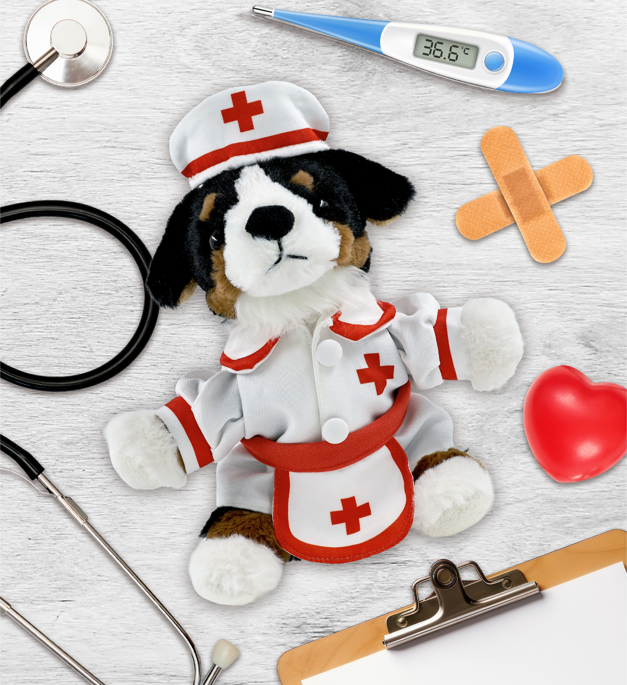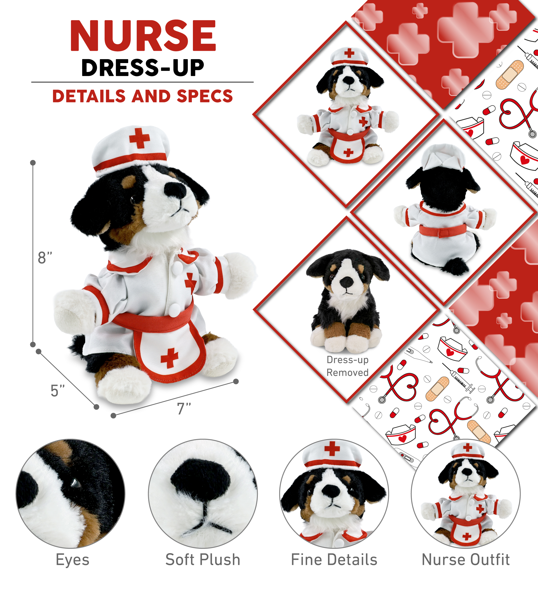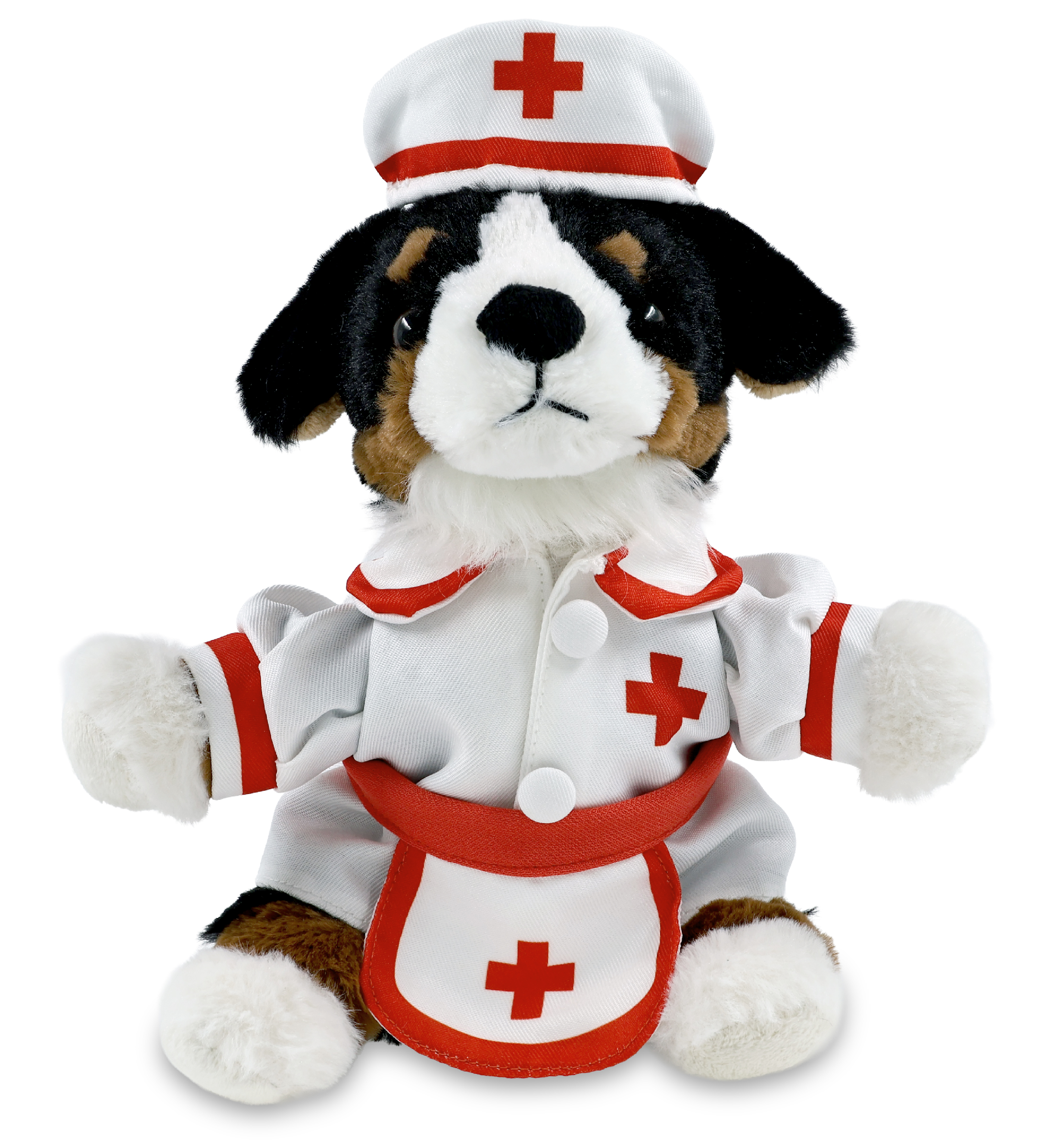 - Bernese Dog with Nurse Stuffed Animal Clothes Features a Classic Nurse Outfit – Designed with red lining and a cross against the white nurse dress and the nurse cap and apron. The Bernese dog stuffed animal plush has soft plush, perfect for everyday snuggles. This stuffed animal with clothes makes the perfect addition to your collection of Bernese dog teddy bear with clothes or giveaway hospital toys to give to sick children.