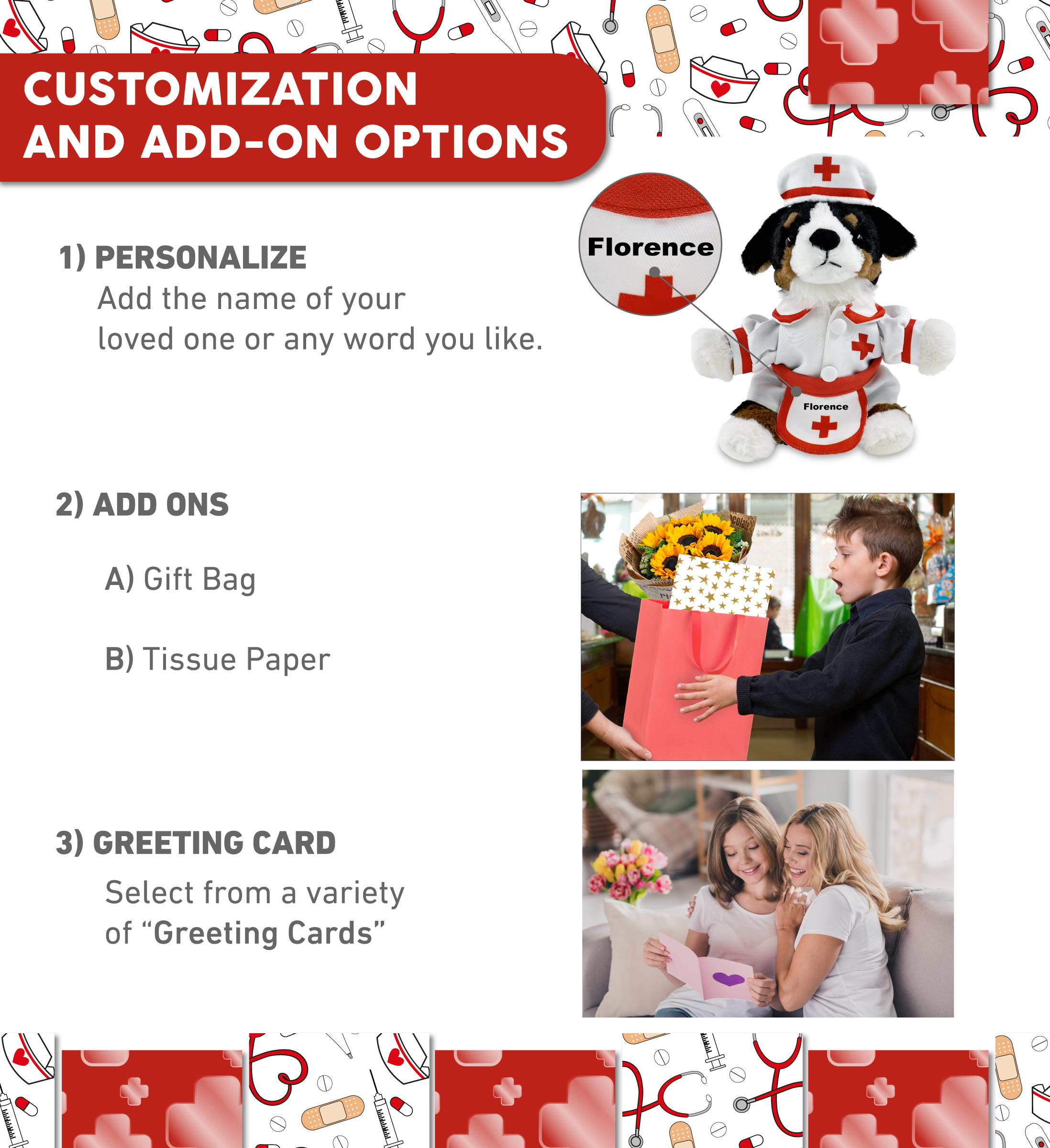 - Personalization, Customization, and Add-On Options – The stuffed Bernese Dog comes dressed in a cute nurse costume, complete with nurse cap, nurse dress and apron. Make your nurse teddy bear stuffed animal plush special by adding a personalized name, which we’ll imprint onto the plush. You can also customize your nurse Bernese dog plush by adding any of our add-ons to create the perfect gift: 1) Gift Bag 2) Tissue Paper 3) Greeting Card.