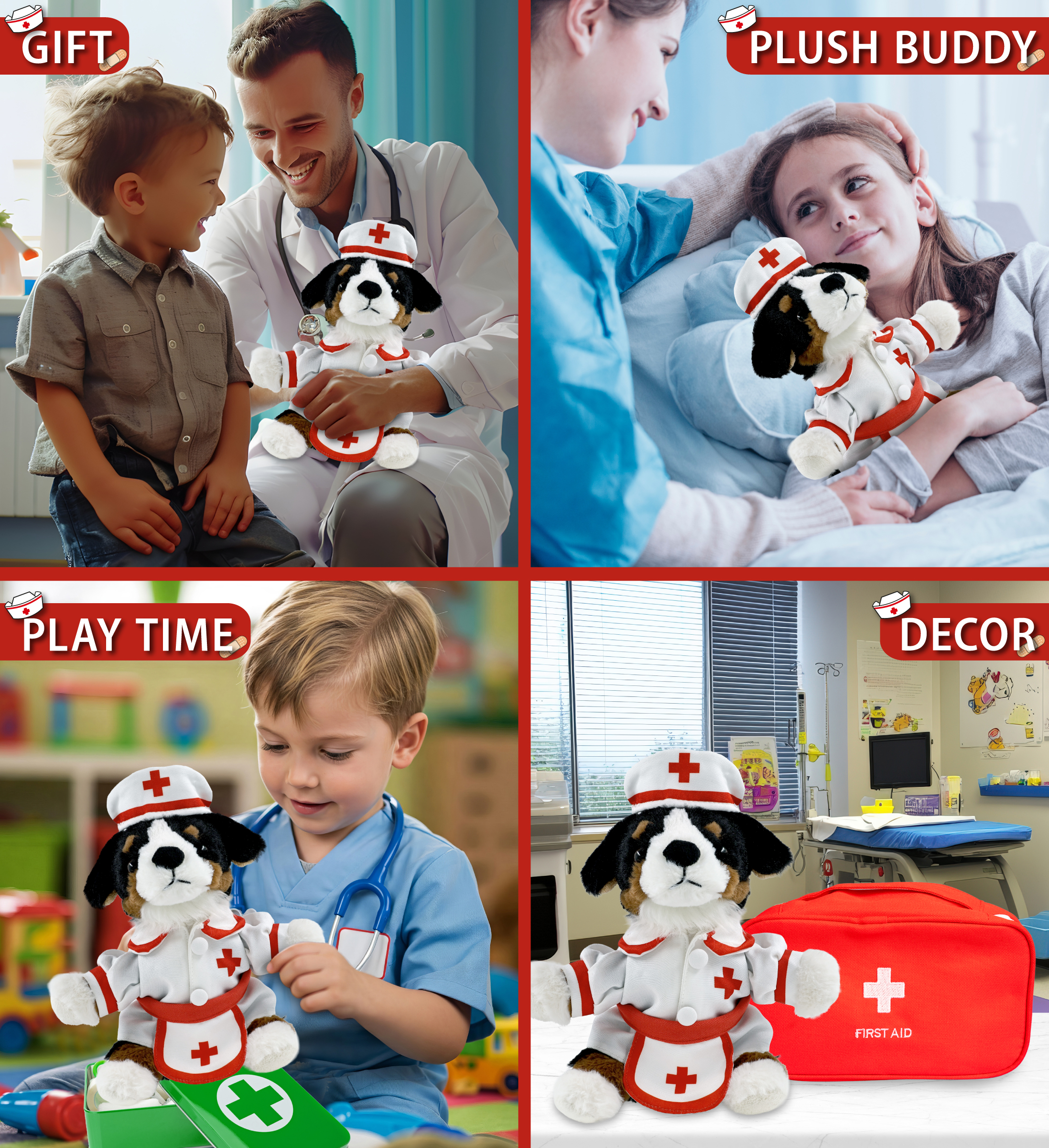 - Perfect Theme Animal Stuffed Toy Nurse Plush for Those Who Appreciate Health Care Workers – If you’re looking for a gift for nurse graduate, a get well teddy bear for your sick friend, the stuffed nurse Bernese dog brings a comforting, playful vibe to any occasion. Ideal hospital gifts for children to make them feel safe or as medical toys for kids to inspire them at a young age. The perfect stuffed animal for nurses and cool storytelling.