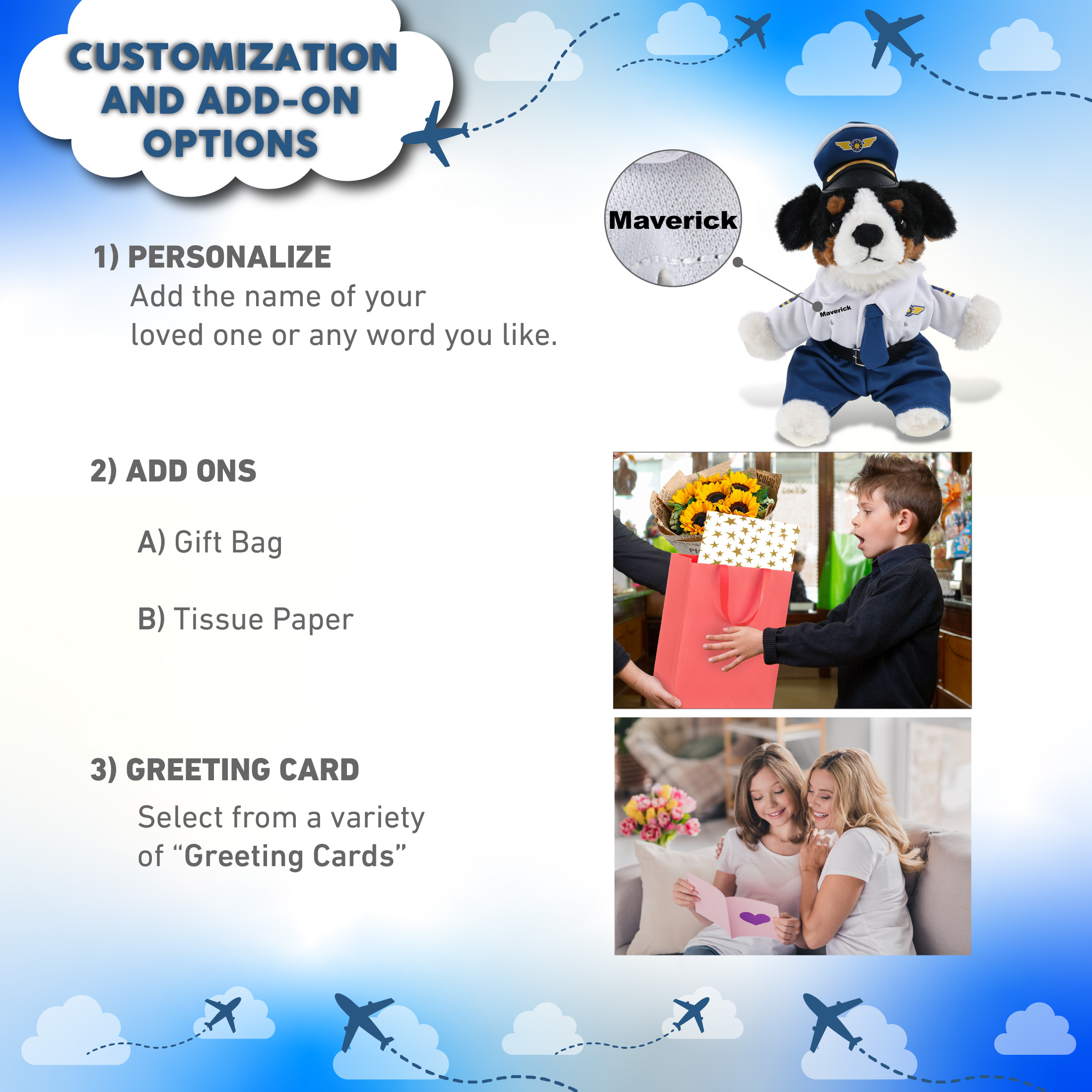 • Personalization, Customization, and Add-On Options – The Bernese dog stuffed animal comes dressed in a full pilot outfit set, with a white pilot shirt, captain hat, belt, and pants. Make your pilot stuffed bear special by adding a personalized name, which we will imprint onto the plush. You can customize your plush pilot toy by adding any of our add-ons to create the perfect gift: 1) Gift Bag 2) Tissue Paper 3) Greeting Card.