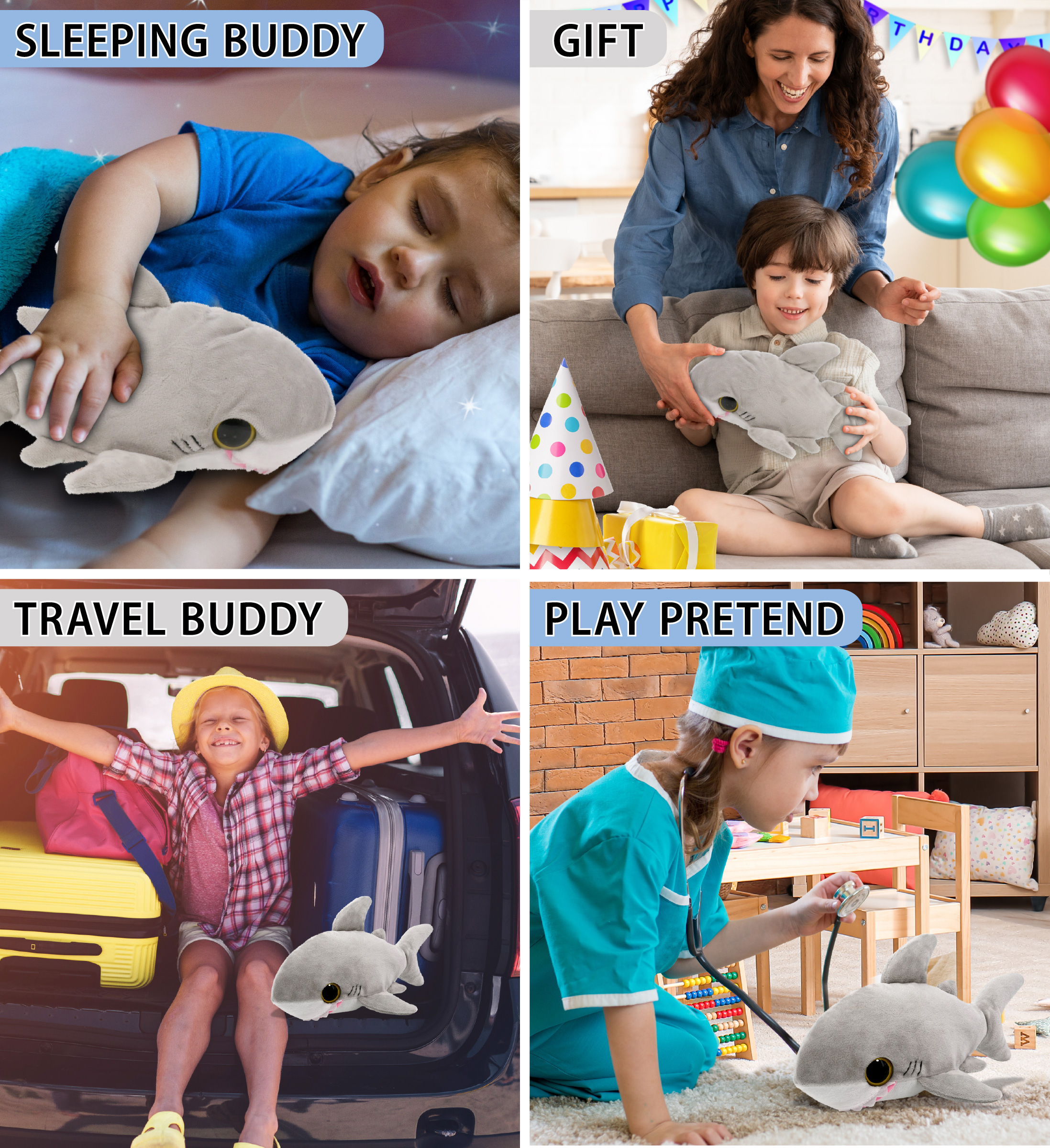 - SOFT & COMFY PLUSH TOY ? Bring the gift of joy to your little ones with this cute and cuddly Shark Plush! An extremely soft & huggable stuffed animal with huge green eye that your kids won’t be able to resist cuddling with. A must-have tag along toy.