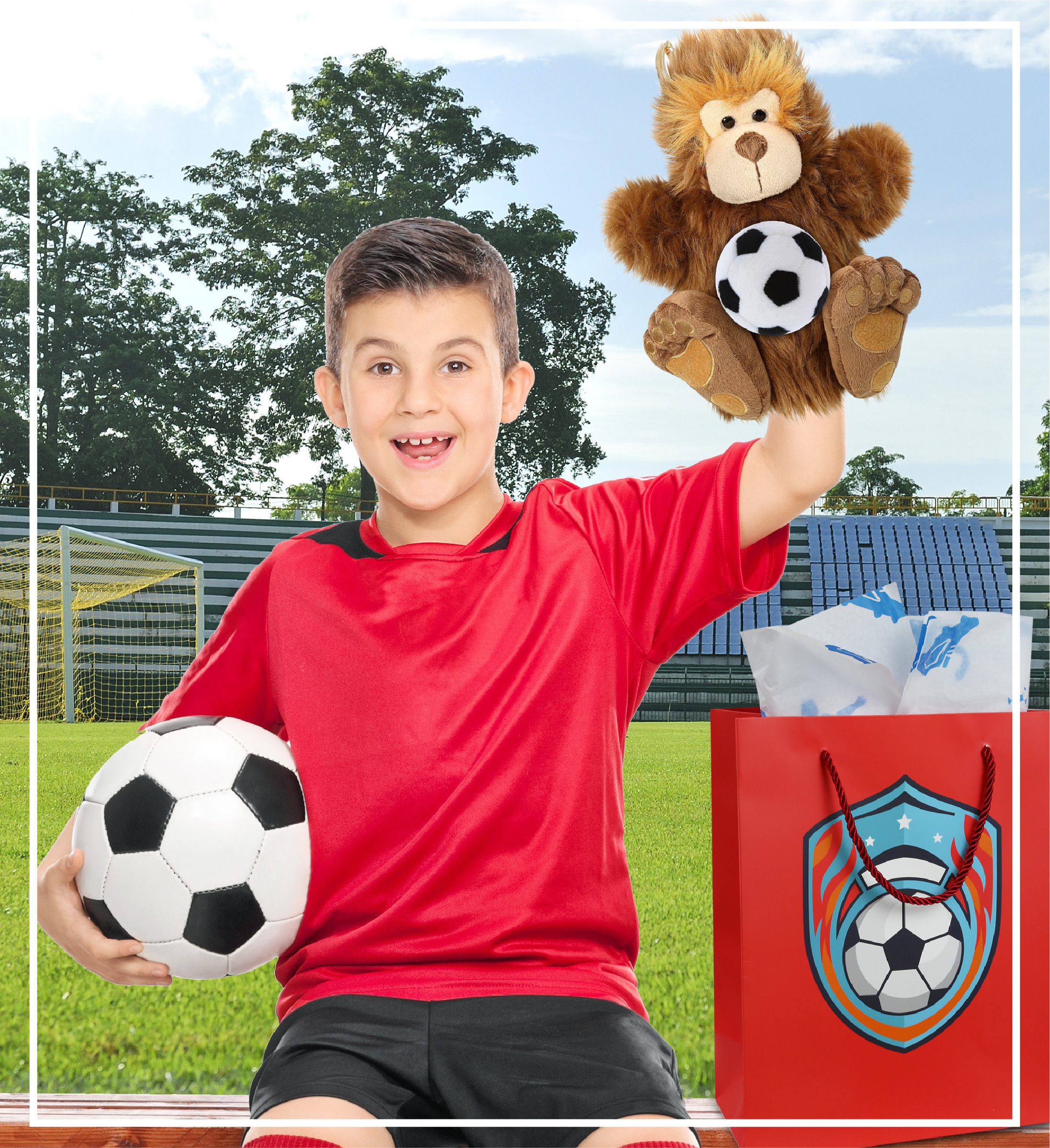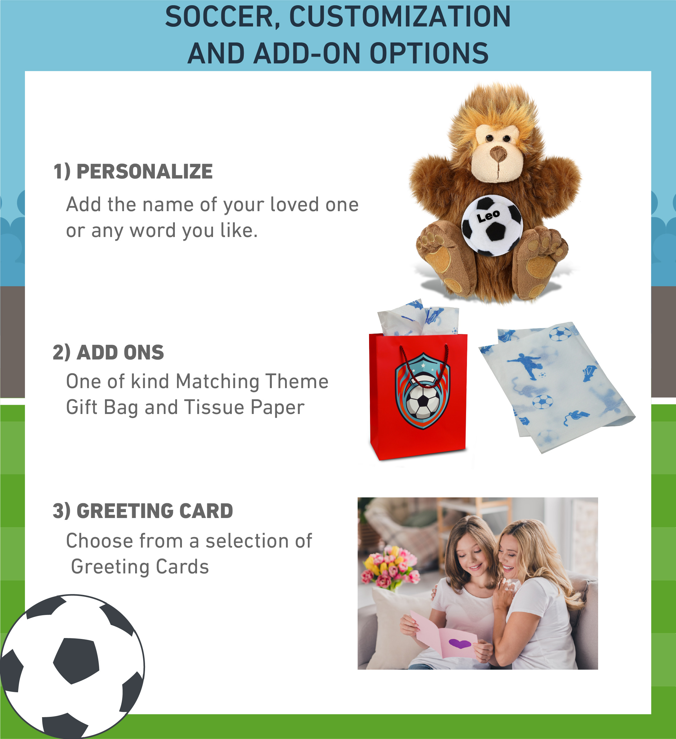 • Personalization, Customization, and Add-On Options – Super Soft Sports Stuffed Animal Big Foot Hand Puppet comes customized with a Soccer Ball Plush. You can personalize it with the name of your loved one imprinted on the item. You also have the option to add some or all of the cool add-ons to make your gift extra special: 1) Gift Bag; 2) Tissue Paper; 3) Greeting Card.