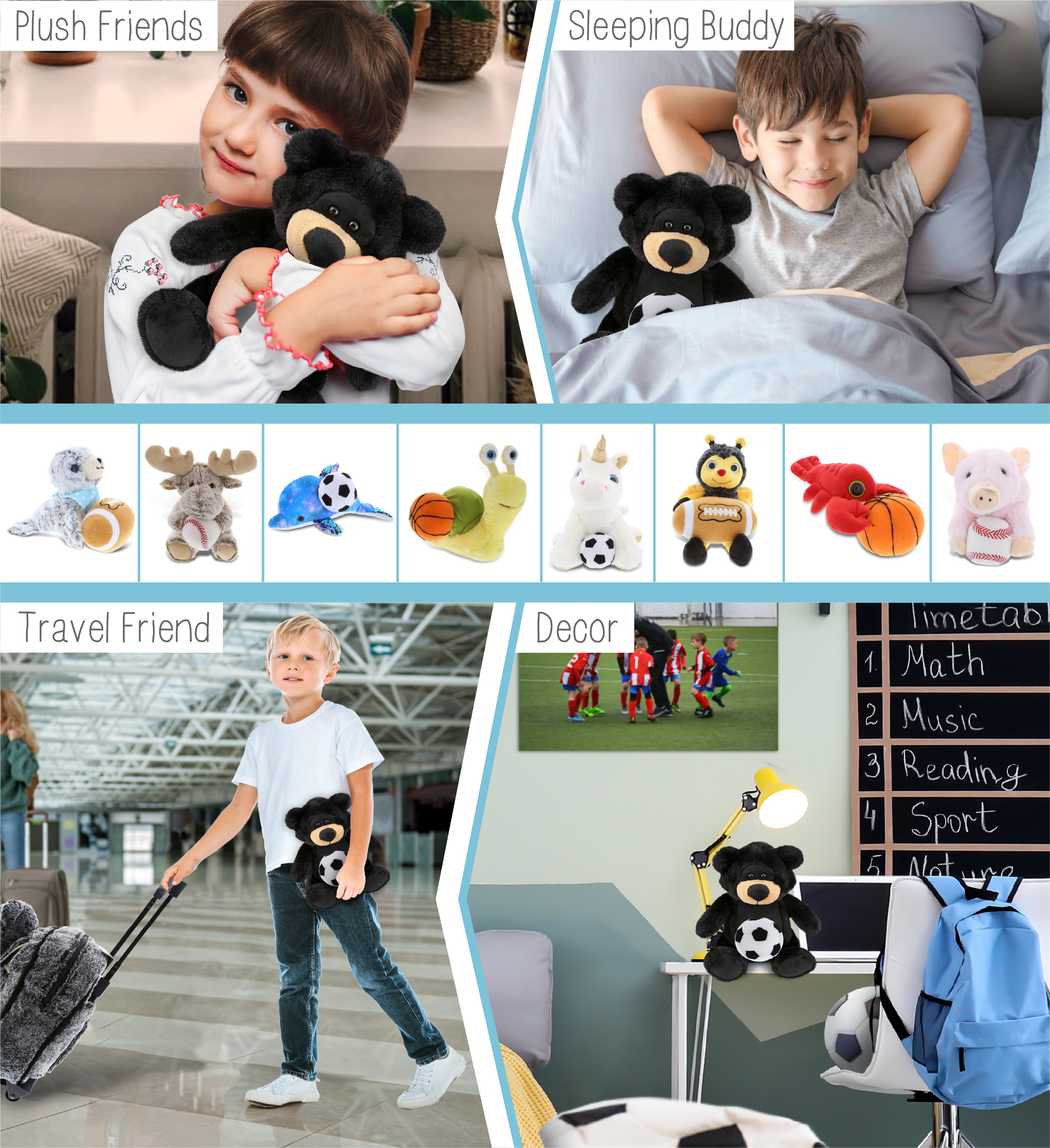 - INCLUDED WITH THE PURCHASE OF ADORABLE CUTE BEAR PLUSH – Includes 1 DolliBu Black Bear Super Soft Plush with a soccer ball plush, decorated with realistic features of cute black bear. The black bear’s body with a sports gift ball plush makes the plush perfect for cuddles. The black bear plush toy features details like its cute ears. The black bear’s eyes make the critter so charming. The cute plush toy buddy measures 6.5LX6.5WX9H inches.
