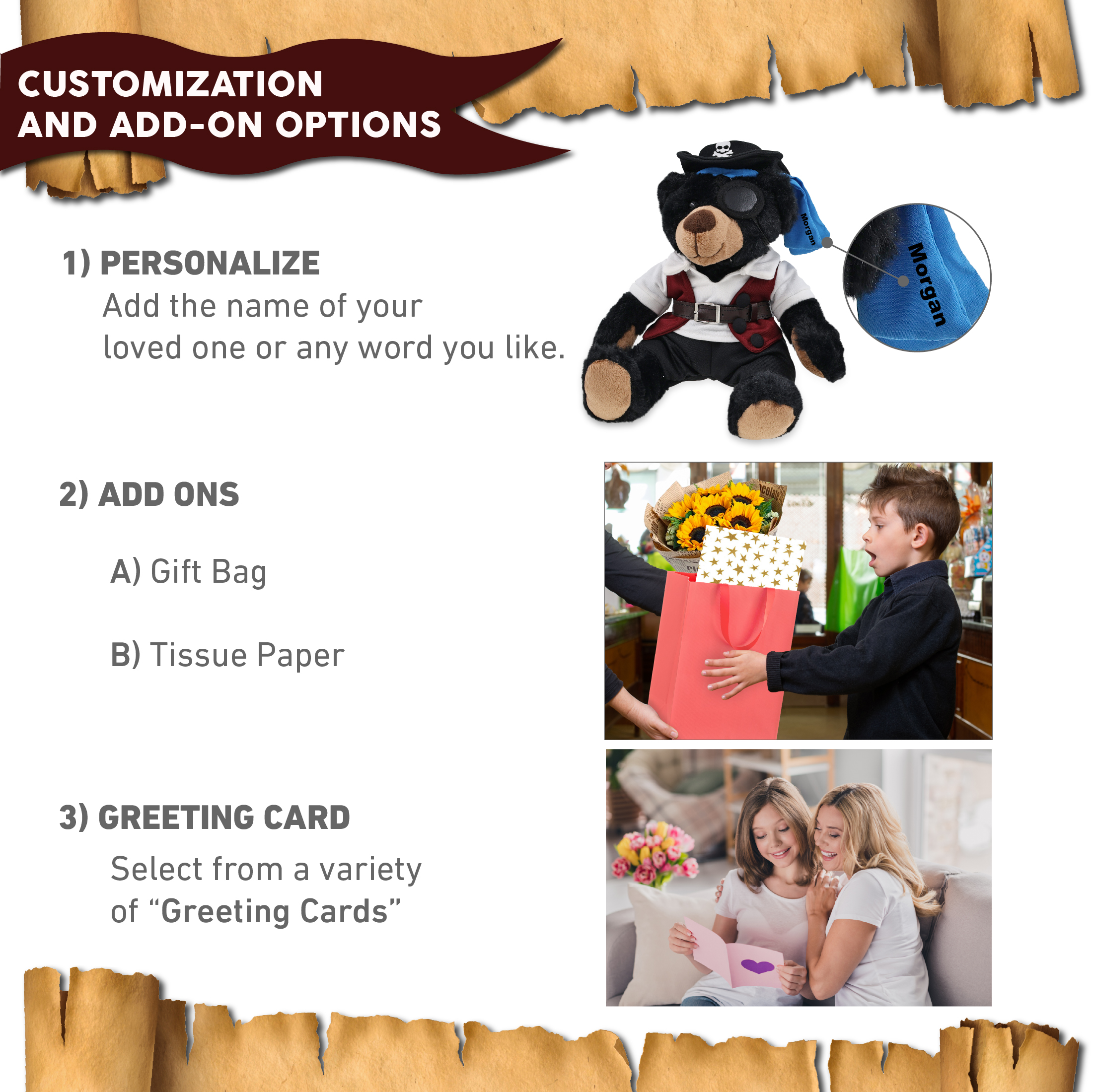 - Personalization, Customization, and Add-On Options – The bear figure stuffed toy comes dressed in full pirate clothes, complete with pirate hat, pirate vest, pirate shirt, pants, belt, and pirate mask. Make your bear doll special by adding a personalized name, which we will imprint onto the plush. You can also customize your stuffed animal bear by adding any of our add-ons to create the perfect gift: 1) Gift Bag 2) Tissue Paper 3) Greeting Card.