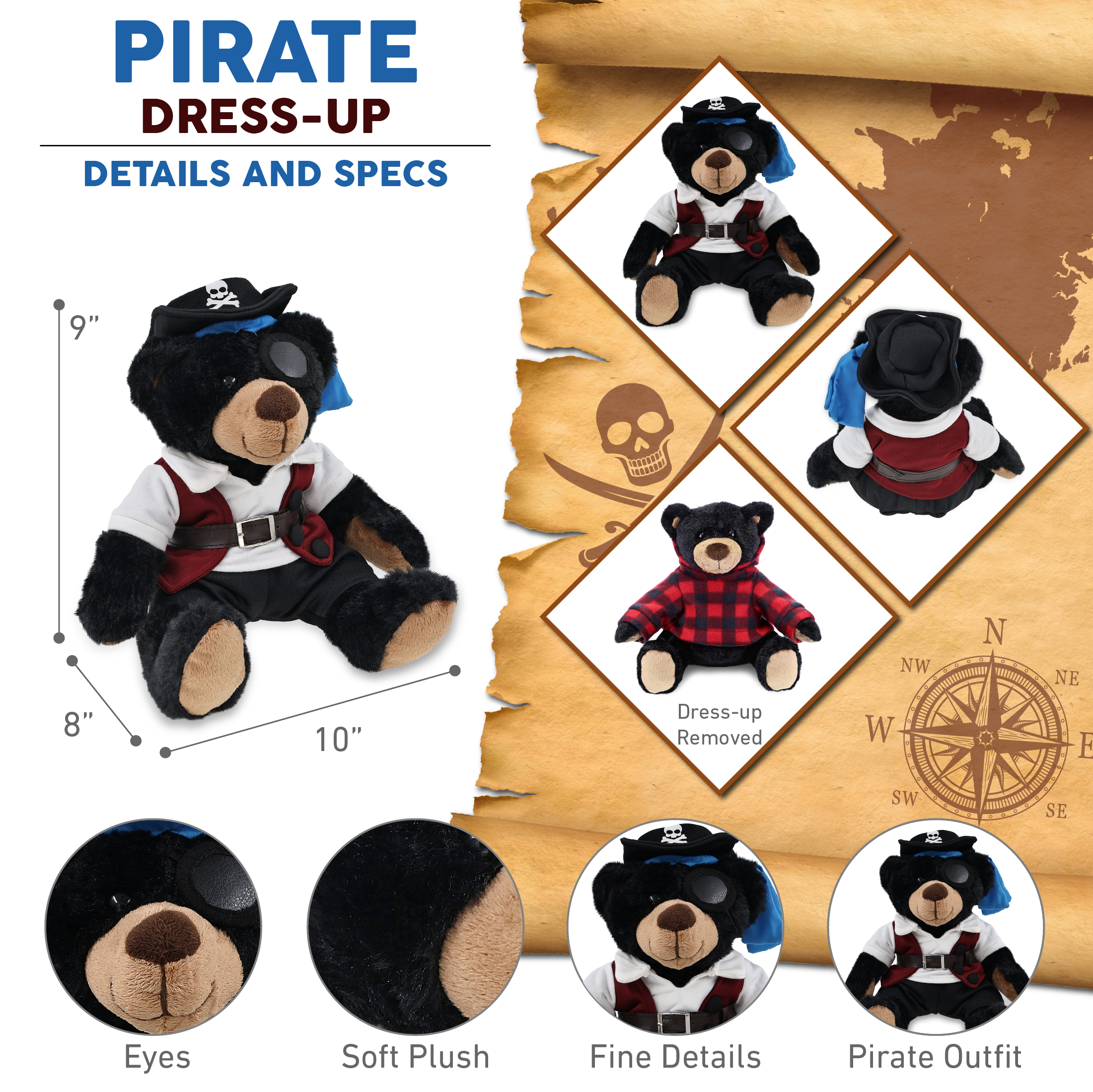 - Includes 1 DolliBu Red Plaid Hoodie Black Bear Stuffed Toy with Pirate Outfit – This bear toy wears a pirate teddy bear costume featuring a pirate vest, belt, shirt, pants and pirate hat. Whether you’re collecting bear toys or hunting for pirate stuff for kids, this cute plush is the perfect combo of silly plush fun and dress-up adventure. This cute pirate stuffed animal bear measures approximately 10Lx8Wx9H inches and is for kids ages 3 and up.