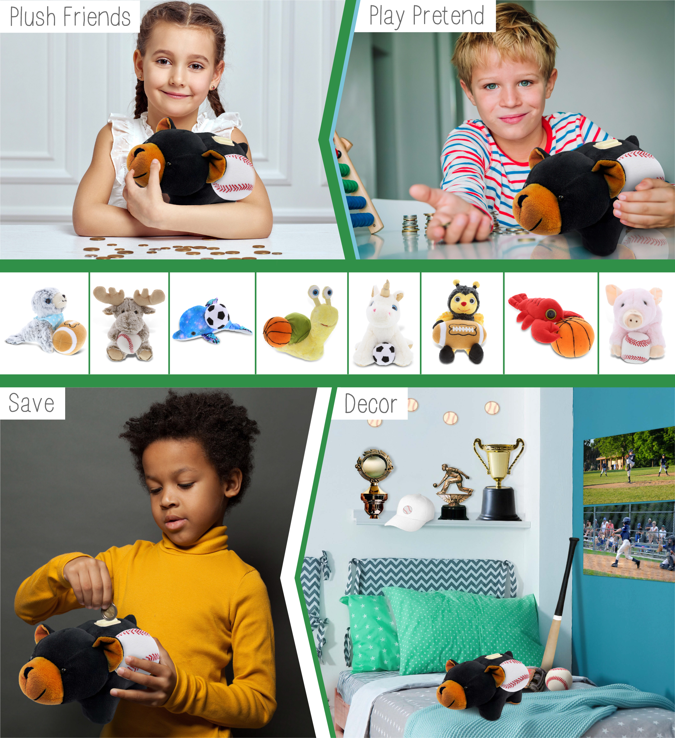 - Ideal Use for the Kids Baseball Plush and Stuffed Bear – The black bear baseball stuffed animal plush bank makes a great addition to your kids baseball stuff for boys collection. Great gifts for boys who love sports plush dolls. If you’re looking for the perfect baseball gift ideas for kids, this stuffed black bear with baseball plush is the perfect choice. It’s the perfect stuffed animal baseball birthday gifts to give on any special occasion.