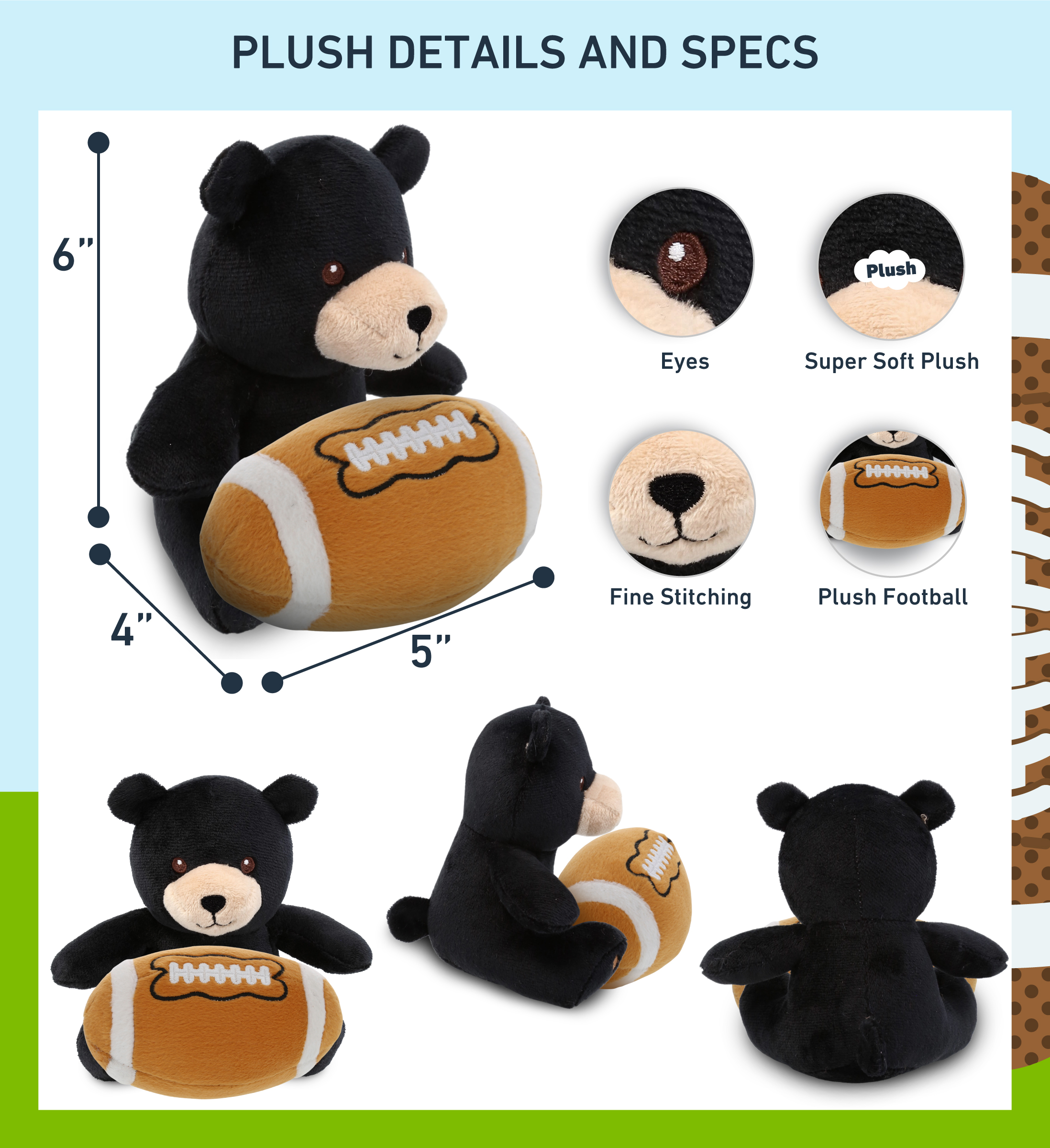 - INCLUDED WITH THE PURCHASE OF ADORABLE CUTE BLACK BEAR PLUSH – Includes 1 DolliBu Black Bear Super Soft Plush with a football plush, decorated with realistic features of cute black bear. The bear’s body with a sports gift ball plush makes the plush perfect for cuddles. The black bear plush toy features details like its characteristic ears. The bear’s eyes make the critter so charming. The cute plush toy buddy measures 5Lx4Wx6H inches.