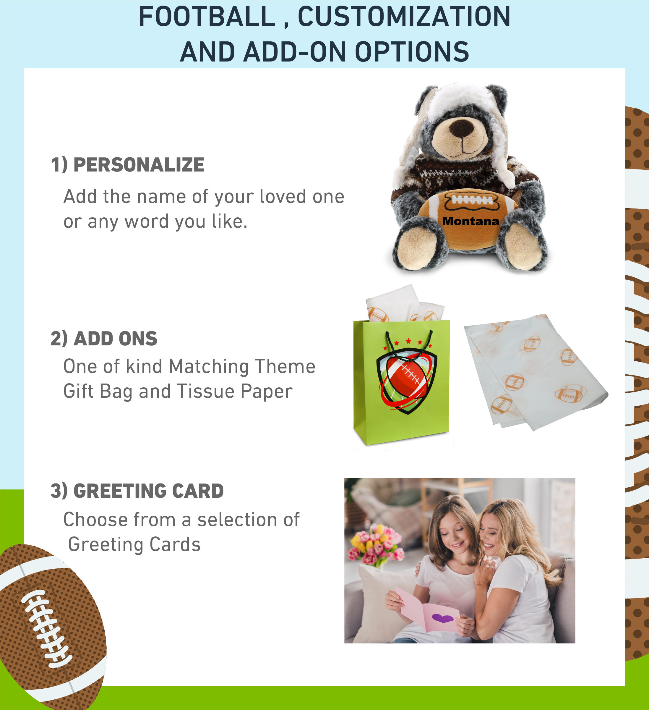 • Personalization, Customization, and Add-On Options – This Super Soft Sports Stuffed Animal Black Bear with Clothes comes customized with a football plush. You can personalize it with the name of your loved one imprinted on the item. You also have the option to add some or all of the cool add-ons to make your gift extra special: 1) Gift Bag; 2) Tissue Paper; 3) Greeting Card.
