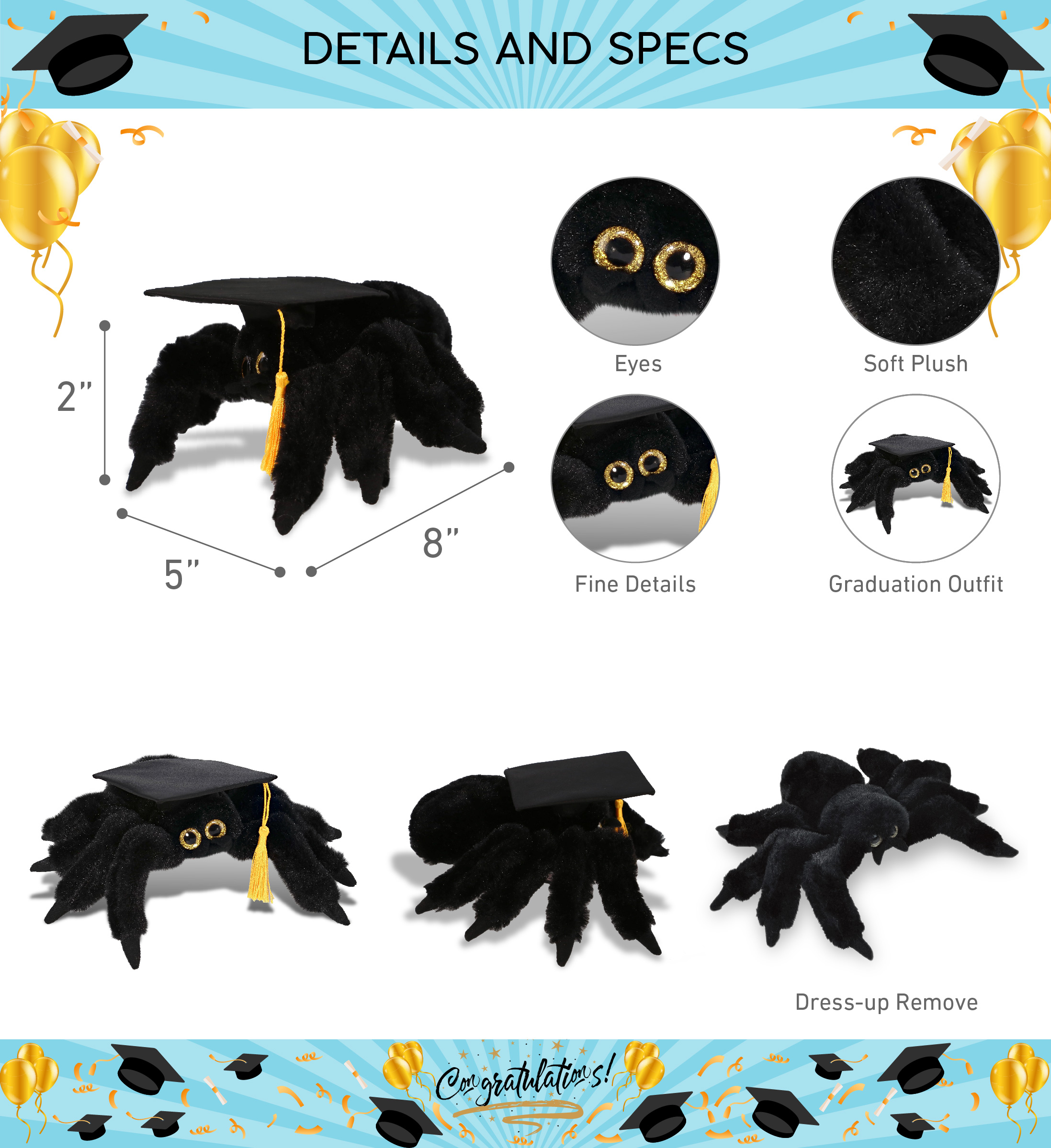 - INCLUDED WITH THE PURCHASE OF SPIDER PLUSH – Includes 1 Super Soft Black Spider Plush Toy with a graduation cap. The adorable black spider plush animal is wearing a removable black graduation cap with a yellow tassel. Decorated with realistic designs like a real black spider, and fluffy plush that makes the graduation custom spider is perfect for cuddles and snuggles. This cute spider graduation stuffed toy measures about 8Lx5Wx2H inches.